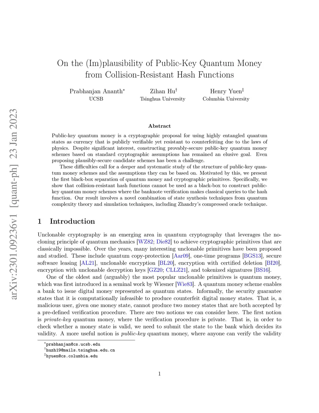 Public-key quantum money is a cryptographic proposal for using highly entangled quantum states as currency that is publicly verifiable yet resistant to counterfeiting due to the laws of physics. Despite significant interest, constructing provably-secure public-key quantum money schemes based on standard cryptographic assumptions has remained an elusive goal. Even proposing plausibly-secure candidate schemes has been a challenge. These difficulties call for a deeper and systematic study of the structure of public-key quantum money schemes and the assumptions they can be based on. Motivated by this, we present the first black-box separation of quantum money and cryptographic primitives. Specifically, we show that collision-resistant hash functions cannot be used as a black-box to construct public-key quantum money schemes where the banknote verification makes classical queries to the hash function. Our result involves a novel combination of state synthesis techniques from quantum complexity theory and simulation techniques, including Zhandry's compressed oracle technique.