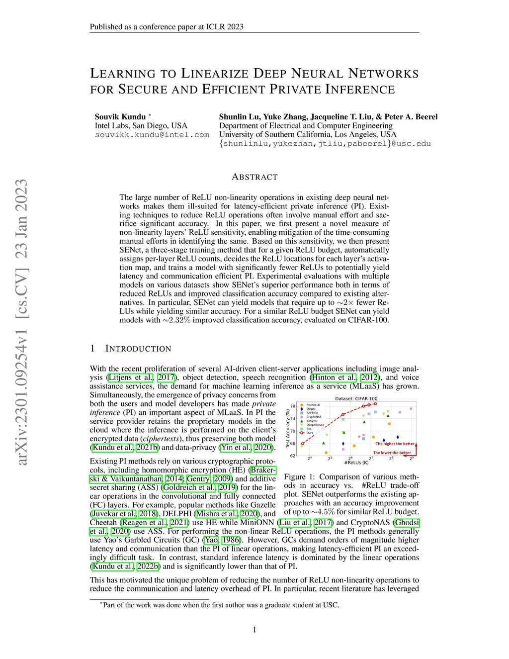 The large number of ReLU non-linearity operations in existing deep neural networks makes them ill-suited for latency-efficient private inference (PI). Existing techniques to reduce ReLU operations often involve manual effort and sacrifice significant accuracy. In this paper, we first present a novel measure of non-linearity layers' ReLU sensitivity, enabling mitigation of the time-consuming manual efforts in identifying the same. Based on this sensitivity, we then present SENet, a three-stage training method that for a given ReLU budget, automatically assigns per-layer ReLU counts, decides the ReLU locations for each layer's activation map, and trains a model with significantly fewer ReLUs to potentially yield latency and communication efficient PI. Experimental evaluations with multiple models on various datasets show SENet's superior performance both in terms of reduced ReLUs and improved classification accuracy compared to existing alternatives. In particular, SENet can yield models that require up to ~2x fewer ReLUs while yielding similar accuracy. For a similar ReLU budget SENet can yield models with ~2.32% improved classification accuracy, evaluated on CIFAR-100.