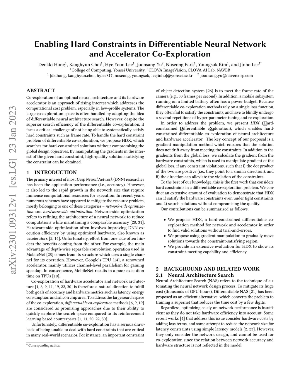 Co-exploration of an optimal neural architecture and its hardware accelerator is an approach of rising interest which addresses the computational cost problem, especially in low-profile systems. The large co-exploration space is often handled by adopting the idea of differentiable neural architecture search. However, despite the superior search efficiency of the differentiable co-exploration, it faces a critical challenge of not being able to systematically satisfy hard constraints such as frame rate. To handle the hard constraint problem of differentiable co-exploration, we propose HDX, which searches for hard-constrained solutions without compromising the global design objectives. By manipulating the gradients in the interest of the given hard constraint, high-quality solutions satisfying the constraint can be obtained.