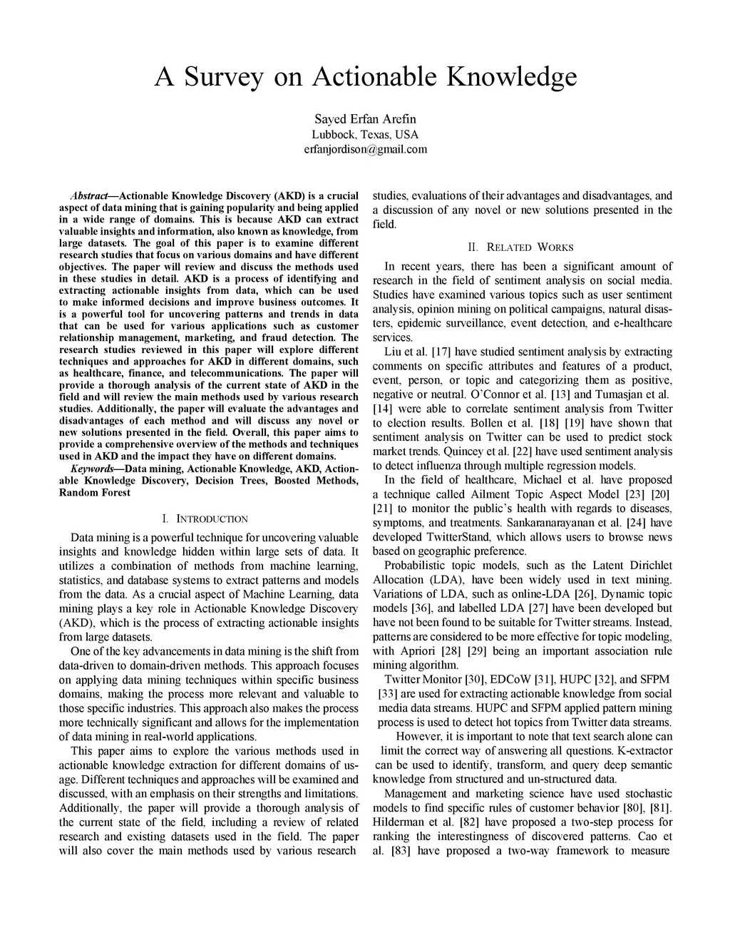 Actionable Knowledge Discovery (AKD) is a crucial aspect of data mining that is gaining popularity and being applied in a wide range of domains. This is because AKD can extract valuable insights and information, also known as knowledge, from large datasets. The goal of this paper is to examine different research studies that focus on various domains and have different objectives. The paper will review and discuss the methods used in these studies in detail. AKD is a process of identifying and extracting actionable insights from data, which can be used to make informed decisions and improve business outcomes. It is a powerful tool for uncovering patterns and trends in data that can be used for various applications such as customer relationship management, marketing, and fraud detection. The research studies reviewed in this paper will explore different techniques and approaches for AKD in different domains, such as healthcare, finance, and telecommunications. The paper will provide a thorough analysis of the current state of AKD in the field and will review the main methods used by various research studies. Additionally, the paper will evaluate the advantages and disadvantages of each method and will discuss any novel or new solutions presented in the field. Overall, this paper aims to provide a comprehensive overview of the methods and techniques used in AKD and the impact they have on different domains.