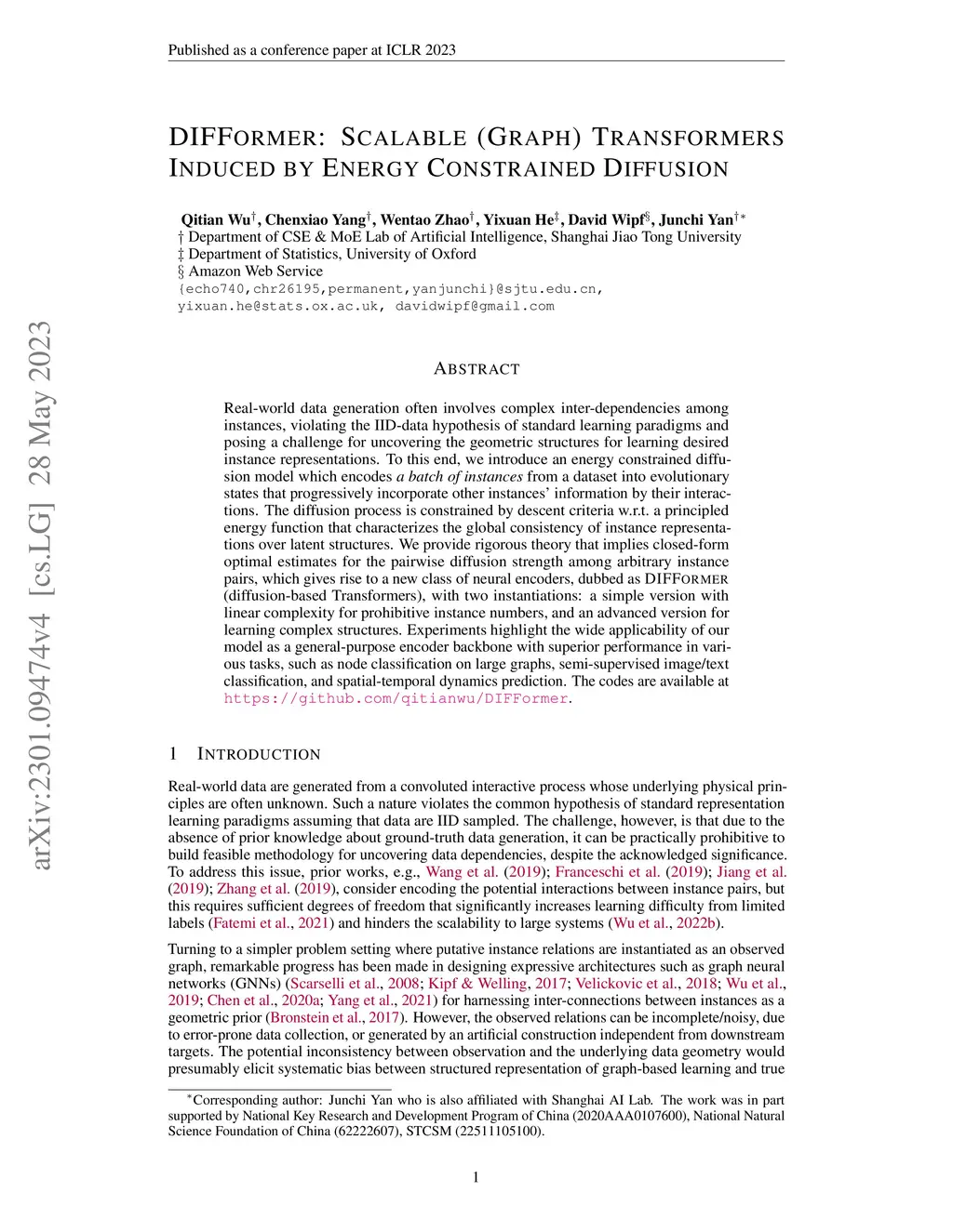 Real-world data generation often involves complex inter-dependencies among instances, violating the IID-data hypothesis of standard learning paradigms and posing a challenge for uncovering the geometric structures for learning desired instance representations. To this end, we introduce an energy constrained diffusion model which encodes a batch of instances from a dataset into evolutionary states that progressively incorporate other instances' information by their interactions. The diffusion process is constrained by descent criteria w.r.t.~a principled energy function that characterizes the global consistency of instance representations over latent structures. We provide rigorous theory that implies closed-form optimal estimates for the pairwise diffusion strength among arbitrary instance pairs, which gives rise to a new class of neural encoders, dubbed as DIFFormer (diffusion-based Transformers), with two instantiations: a simple version with linear complexity for prohibitive instance numbers, and an advanced version for learning complex structures. Experiments highlight the wide applicability of our model as a general-purpose encoder backbone with superior performance in various tasks, such as node classification on large graphs, semi-supervised image/text classification, and spatial-temporal dynamics prediction.