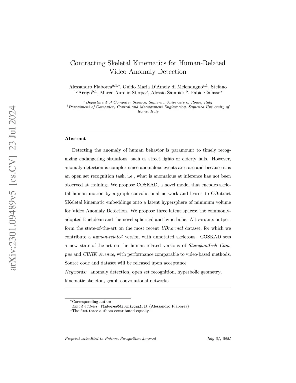 Detecting the anomaly of human behavior is paramount to timely recognizing endangering situations, such as street fights or elderly falls. However, anomaly detection is complex since anomalous events are rare and because it is an open set recognition task, i.e., what is anomalous at inference has not been observed at training. We propose COSKAD, a novel model that encodes skeletal human motion by a graph convolutional network and learns to COntract SKeletal kinematic embeddings onto a latent hypersphere of minimum volume for Video Anomaly Detection. We propose three latent spaces: the commonly-adopted Euclidean and the novel spherical and hyperbolic. All variants outperform the state-of-the-art on the most recent UBnormal dataset, for which we contribute a human-related version with annotated skeletons. COSKAD sets a new state-of-the-art on the human-related versions of ShanghaiTech Campus and CUHK Avenue, with performance comparable to video-based methods. Source code and dataset will be released upon acceptance.