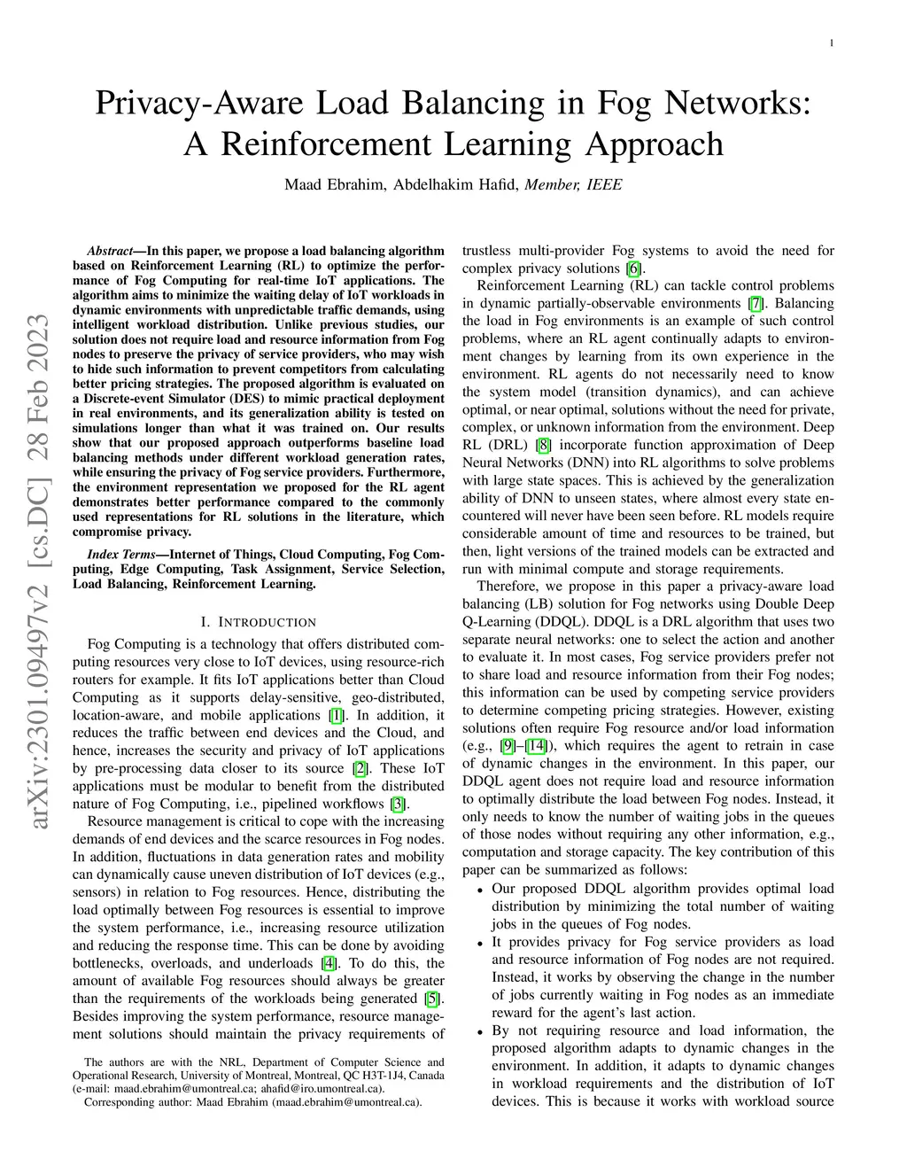 In this paper, we propose a load balancing algorithm based on Reinforcement Learning (RL) to optimize the performance of Fog Computing for real-time IoT applications. The algorithm aims to minimize the waiting delay of IoT workloads in dynamic environments with unpredictable traffic demands, using intelligent workload distribution. Unlike previous studies, our solution does not require load and resource information from Fog nodes to preserve the privacy of service providers, who may wish to hide such information to prevent competitors from calculating better pricing strategies. The proposed algorithm is evaluated on a Discrete-event Simulator (DES) to mimic practical deployment in real environments, and its generalization ability is tested on simulations longer than what it was trained on. Our results show that our proposed approach outperforms baseline load balancing methods under different workload generation rates, while ensuring the privacy of Fog service providers. Furthermore, the environment representation we proposed for the RL agent demonstrates better performance compared to the commonly used representations for RL solutions in the literature, which compromise privacy.