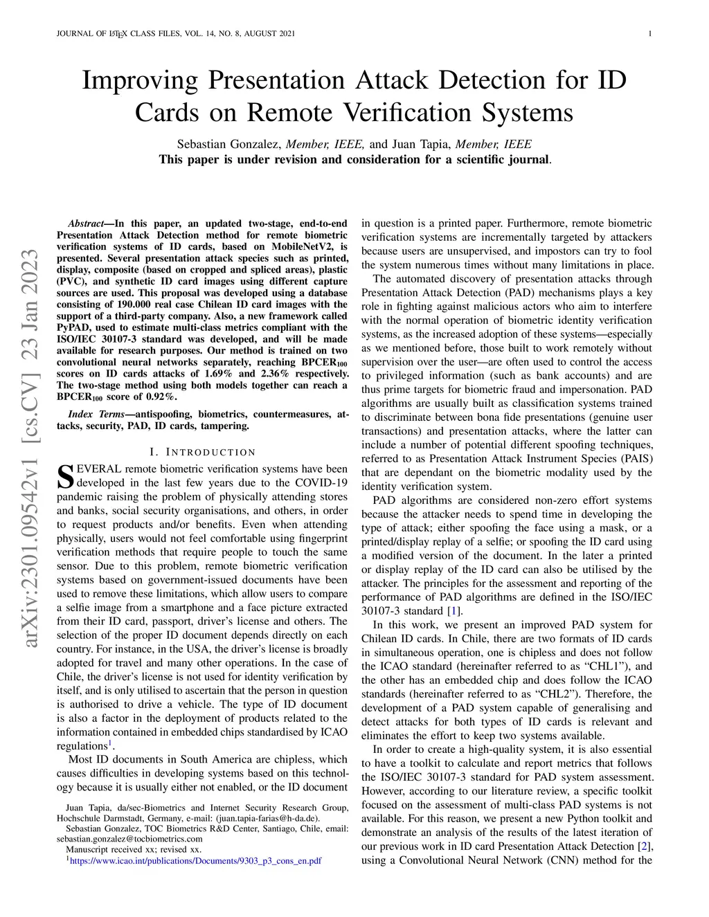 In this paper, an updated two-stage, end-to-end Presentation Attack Detection method for remote biometric verification systems of ID cards, based on MobileNetV2, is presented. Several presentation attack species such as printed, display, composite (based on cropped and spliced areas), plastic (PVC), and synthetic ID card images using different capture sources are used. This proposal was developed using a database consisting of 190.000 real case Chilean ID card images with the support of a third-party company. Also, a new framework called PyPAD, used to estimate multi-class metrics compliant with the ISO/IEC 30107-3 standard was developed, and will be made available for research purposes. Our method is trained on two convolutional neural networks separately, reaching BPCER\textsubscript{100} scores on ID cards attacks of 1.69\% and 2.36\% respectively. The two-stage method using both models together can reach a BPCER\textsubscript{100} score of 0.92\%.