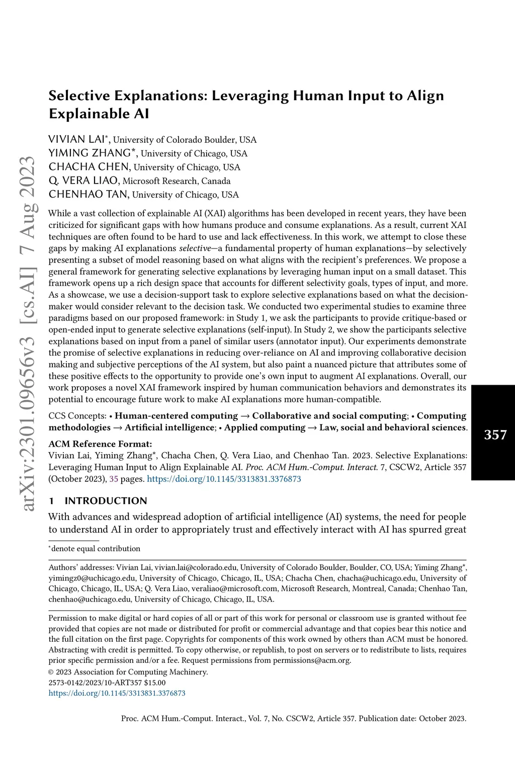 While a vast collection of explainable AI (XAI) algorithms have been developed in recent years, they are often criticized for significant gaps with how humans produce and consume explanations. As a result, current XAI techniques are often found to be hard to use and lack effectiveness. In this work, we attempt to close these gaps by making AI explanations selective -- a fundamental property of human explanations -- by selectively presenting a subset from a large set of model reasons based on what aligns with the recipient's preferences. We propose a general framework for generating selective explanations by leveraging human input on a small sample. This framework opens up a rich design space that accounts for different selectivity goals, types of input, and more. As a showcase, we use a decision-support task to explore selective explanations based on what the decision-maker would consider relevant to the decision task. We conducted two experimental studies to examine three out of a broader possible set of paradigms based on our proposed framework: in Study 1, we ask the participants to provide their own input to generate selective explanations, with either open-ended or critique-based input. In Study 2, we show participants selective explanations based on input from a panel of similar users (annotators). Our experiments demonstrate the promise of selective explanations in reducing over-reliance on AI and improving decision outcomes and subjective perceptions of the AI, but also paint a nuanced picture that attributes some of these positive effects to the opportunity to provide one's own input to augment AI explanations. Overall, our work proposes a novel XAI framework inspired by human communication behaviors and demonstrates its potentials to encourage future work to better align AI explanations with human production and consumption of explanations.