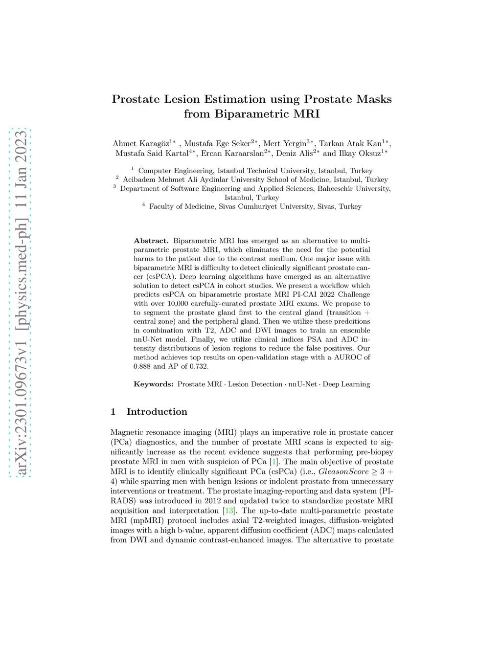 Biparametric MRI has emerged as an alternative to multiparametric prostate MRI, which eliminates the need for the potential harms to the patient due to the contrast medium. One major issue with biparametric MRI is difficulty to detect clinically significant prostate cancer (csPCA). Deep learning algorithms have emerged as an alternative solution to detect csPCA in cohort studies. We present a workflow which predicts csPCA on biparametric prostate MRI PI-CAI 2022 Challenge with over 10,000 carefully-curated prostate MRI exams. We propose to to segment the prostate gland first to the central gland (transition + central zone) and the peripheral gland. Then we utilize these predcitions in combination with T2, ADC and DWI images to train an ensemble nnU-Net model. Finally, we utilize clinical indices PSA and ADC intensity distributions of lesion regions to reduce the false positives. Our method achieves top results on open-validation stage with a AUROC of 0.888 and AP of 0.732.