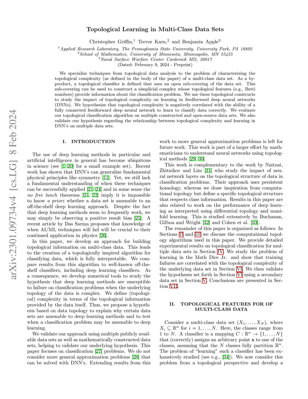 We specialize techniques from topological data analysis to the problem of characterizing the topological complexity (as defined in the body of the paper) of a multi-class data set. As a by-product, a topological classifier is defined that uses an open sub-covering of the data set. This sub-covering can be used to construct a simplicial complex whose topological features (e.g., Betti numbers) provide information about the classification problem. We use these topological constructs to study the impact of topological complexity on learning in feedforward deep neural networks (DNNs). We hypothesize that topological complexity is negatively correlated with the ability of a fully connected feedforward deep neural network to learn to classify data correctly. We evaluate our topological classification algorithm on multiple constructed and open source data sets. We also validate our hypothesis regarding the relationship between topological complexity and learning in DNN's on multiple data sets.