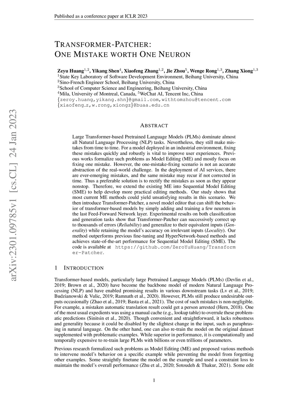 Transformer-Patcher: One Mistake worth One Neuron