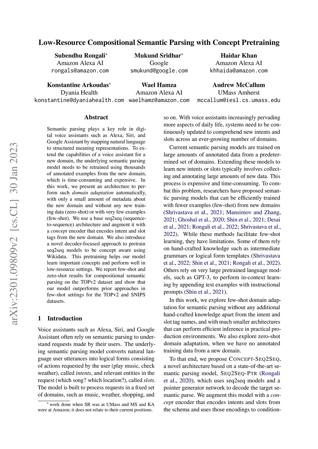 Semantic parsing plays a key role in digital voice assistants such as Alexa, Siri, and Google Assistant by mapping natural language to structured meaning representations. When we want to improve the capabilities of a voice assistant by adding a new domain, the underlying semantic parsing model needs to be retrained using thousands of annotated examples from the new domain, which is time-consuming and expensive. In this work, we present an architecture to perform such domain adaptation automatically, with only a small amount of metadata about the new domain and without any new training data (zero-shot) or with very few examples (few-shot). We use a base seq2seq (sequence-to-sequence) architecture and augment it with a concept encoder that encodes intent and slot tags from the new domain. We also introduce a novel decoder-focused approach to pretrain seq2seq models to be concept aware using Wikidata and use it to help our model learn important concepts and perform well in low-resource settings. We report few-shot and zero-shot results for compositional semantic parsing on the TOPv2 dataset and show that our model outperforms prior approaches in few-shot settings for the TOPv2 and SNIPS datasets.