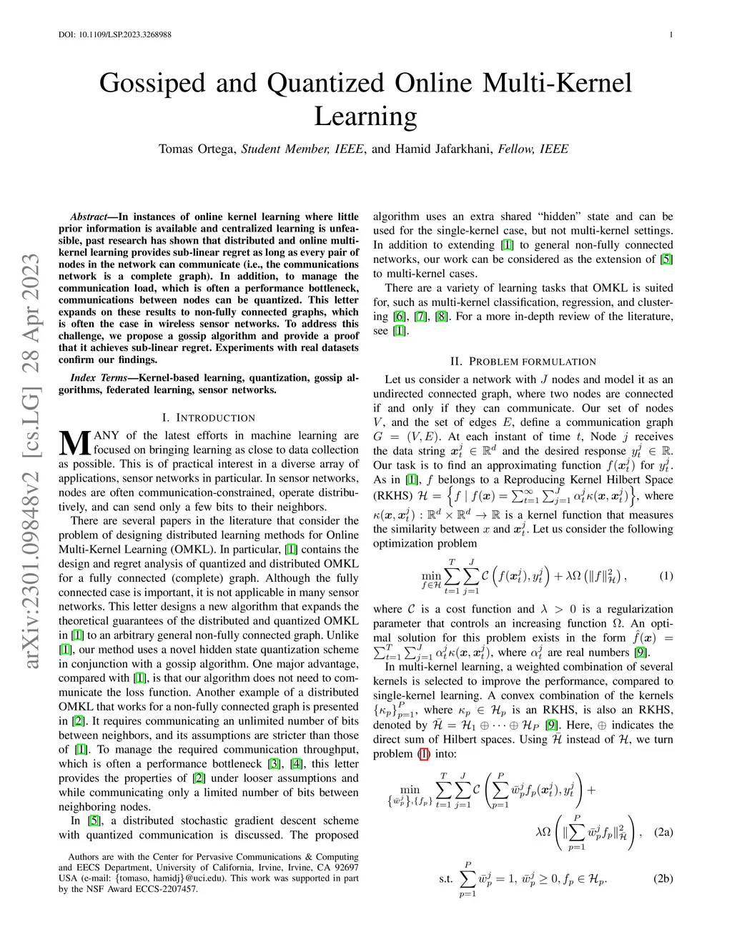 In instances of online kernel learning where little prior information is available and centralized learning is unfeasible, past research has shown that distributed and online multi-kernel learning provides sub-linear regret as long as every pair of nodes in the network can communicate (i.e., the communications network is a complete graph). In addition, to manage the communication load, which is often a performance bottleneck, communications between nodes can be quantized. This letter expands on these results to non-fully connected graphs, which is often the case in wireless sensor networks. To address this challenge, we propose a gossip algorithm and provide a proof that it achieves sub-linear regret. Experiments with real datasets confirm our findings.