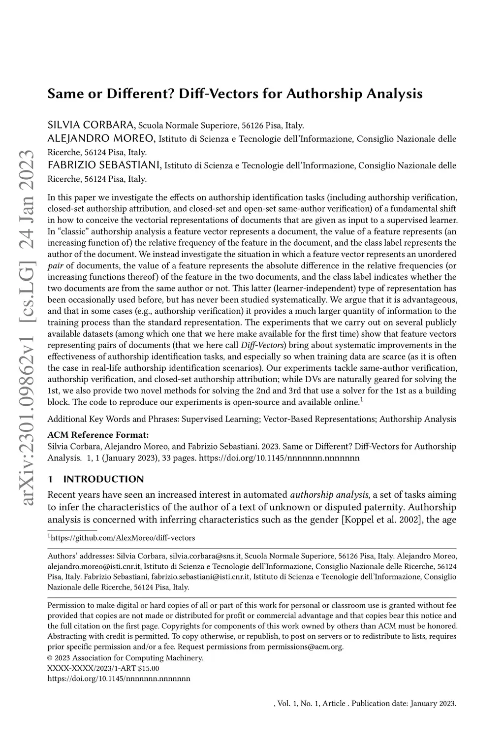 We investigate the effects on authorship identification tasks of a fundamental shift in how to conceive the vectorial representations of documents that are given as input to a supervised learner. In ``classic'' authorship analysis a feature vector represents a document, the value of a feature represents (an increasing function of) the relative frequency of the feature in the document, and the class label represents the author of the document. We instead investigate the situation in which a feature vector represents an unordered pair of documents, the value of a feature represents the absolute difference in the relative frequencies (or increasing functions thereof) of the feature in the two documents, and the class label indicates whether the two documents are from the same author or not. This latter (learner-independent) type of representation has been occasionally used before, but has never been studied systematically. We argue that it is advantageous, and that in some cases (e.g., authorship verification) it provides a much larger quantity of information to the training process than the standard representation. The experiments that we carry out on several publicly available datasets (among which one that we here make available for the first time) show that feature vectors representing pairs of documents (that we here call Diff-Vectors) bring about systematic improvements in the effectiveness of authorship identification tasks, and especially so when training data are scarce (as it is often the case in real-life authorship identification scenarios). Our experiments tackle same-author verification, authorship verification, and closed-set authorship attribution; while DVs are naturally geared for solving the 1st, we also provide two novel methods for solving the 2nd and 3rd that use a solver for the 1st as a building block.