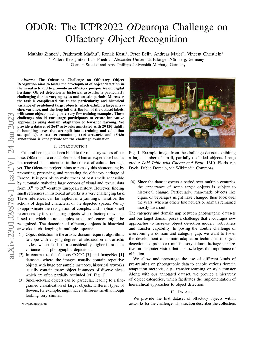 The Odeuropa Challenge on Olfactory Object Recognition aims to foster the development of object detection in the visual arts and to promote an olfactory perspective on digital heritage. Object detection in historical artworks is particularly challenging due to varying styles and artistic periods. Moreover, the task is complicated due to the particularity and historical variance of predefined target objects, which exhibit a large intra-class variance, and the long tail distribution of the dataset labels, with some objects having only very few training examples. These challenges should encourage participants to create innovative approaches using domain adaptation or few-shot learning. We provide a dataset of 2647 artworks annotated with 20 120 tightly fit bounding boxes that are split into a training and validation set (public). A test set containing 1140 artworks and 15 480 annotations is kept private for the challenge evaluation.