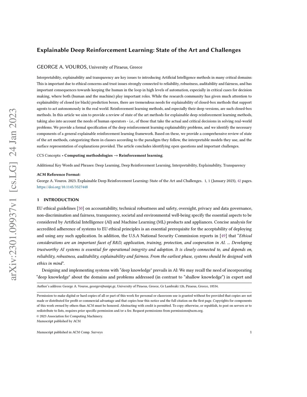 Interpretability, explainability and transparency are key issues to introducing Artificial Intelligence methods in many critical domains: This is important due to ethical concerns and trust issues strongly connected to reliability, robustness, auditability and fairness, and has important consequences towards keeping the human in the loop in high levels of automation, especially in critical cases for decision making, where both (human and the machine) play important roles. While the research community has given much attention to explainability of closed (or black) prediction boxes, there are tremendous needs for explainability of closed-box methods that support agents to act autonomously in the real world. Reinforcement learning methods, and especially their deep versions, are such closed-box methods. In this article we aim to provide a review of state of the art methods for explainable deep reinforcement learning methods, taking also into account the needs of human operators - i.e., of those that take the actual and critical decisions in solving real-world problems. We provide a formal specification of the deep reinforcement learning explainability problems, and we identify the necessary components of a general explainable reinforcement learning framework. Based on these, we provide a comprehensive review of state of the art methods, categorizing them in classes according to the paradigm they follow, the interpretable models they use, and the surface representation of explanations provided. The article concludes identifying open questions and important challenges.