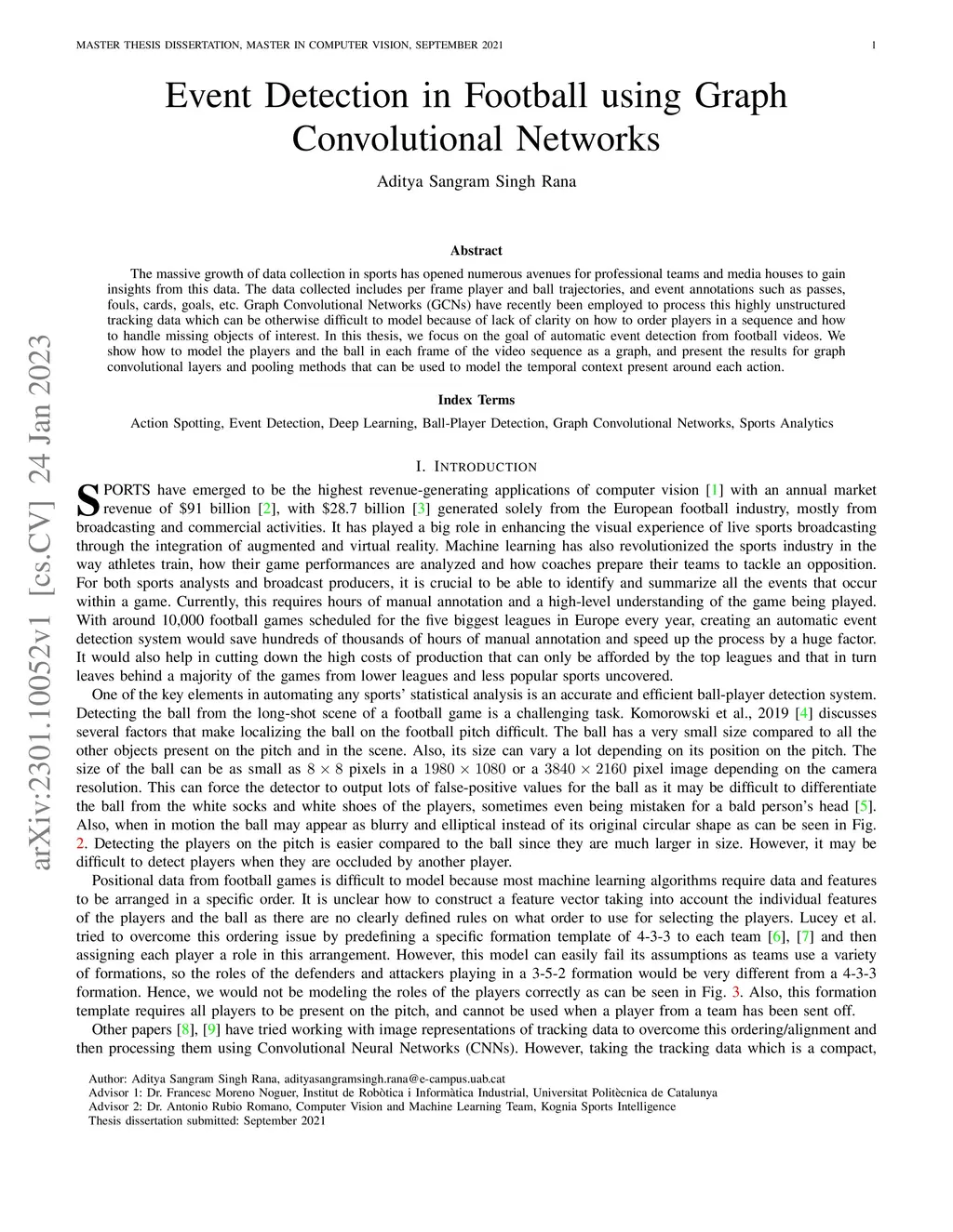 The massive growth of data collection in sports has opened numerous avenues for professional teams and media houses to gain insights from this data. The data collected includes per frame player and ball trajectories, and event annotations such as passes, fouls, cards, goals, etc. Graph Convolutional Networks (GCNs) have recently been employed to process this highly unstructured tracking data which can be otherwise difficult to model because of lack of clarity on how to order players in a sequence and how to handle missing objects of interest. In this thesis, we focus on the goal of automatic event detection from football videos. We show how to model the players and the ball in each frame of the video sequence as a graph, and present the results for graph convolutional layers and pooling methods that can be used to model the temporal context present around each action.