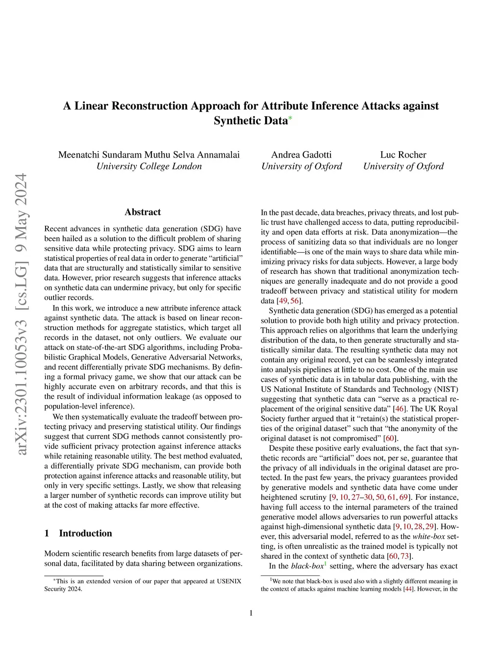Recent advances in synthetic data generation (SDG) have been hailed as a solution to the difficult problem of sharing sensitive data while protecting privacy. SDG aims to learn statistical properties of real data in order to generate "artificial" data that are structurally and statistically similar to sensitive data. However, prior research suggests that inference attacks on synthetic data can undermine privacy, but only for specific outlier records. In this work, we introduce a new attribute inference attack against synthetic data. The attack is based on linear reconstruction methods for aggregate statistics, which target all records in the dataset, not only outliers. We evaluate our attack on state-of-the-art SDG algorithms, including Probabilistic Graphical Models, Generative Adversarial Networks, and recent differentially private SDG mechanisms. By defining a formal privacy game, we show that our attack can be highly accurate even on arbitrary records, and that this is the result of individual information leakage (as opposed to population-level inference). We then systematically evaluate the tradeoff between protecting privacy and preserving statistical utility. Our findings suggest that current SDG methods cannot consistently provide sufficient privacy protection against inference attacks while retaining reasonable utility. The best method evaluated, a differentially private SDG mechanism, can provide both protection against inference attacks and reasonable utility, but only in very specific settings. Lastly, we show that releasing a larger number of synthetic records can improve utility but at the cost of making attacks far more effective.