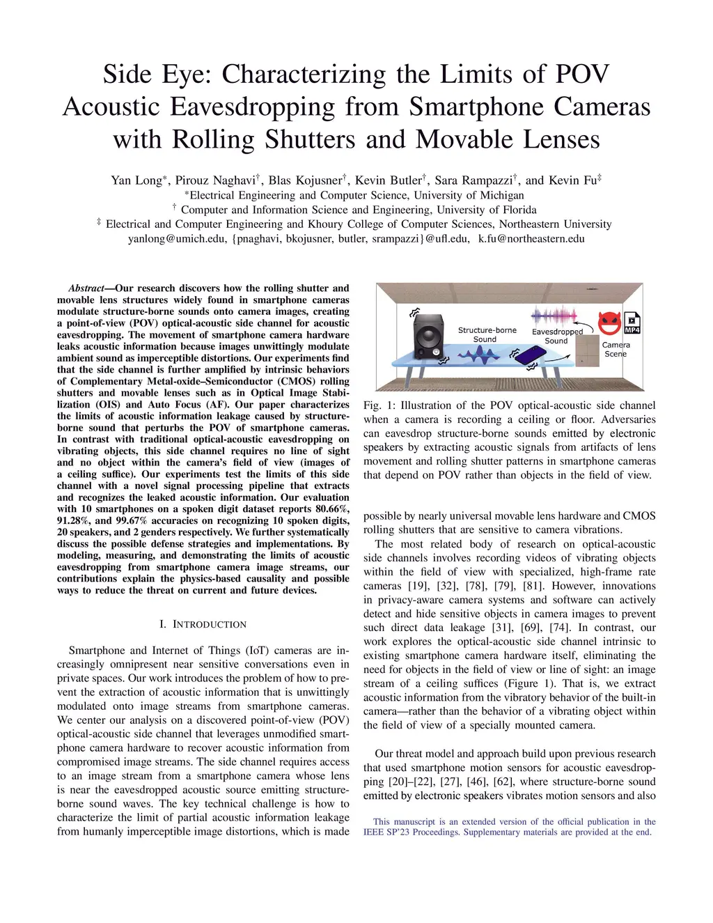 Our research discovers how the rolling shutter and movable lens structures widely found in smartphone cameras modulate structure-borne sounds onto camera images, creating a point-of-view (POV) optical-acoustic side channel for acoustic eavesdropping. The movement of smartphone camera hardware leaks acoustic information because images unwittingly modulate ambient sound as imperceptible distortions. Our experiments find that the side channel is further amplified by intrinsic behaviors of Complementary metal-oxide-semiconductor (CMOS) rolling shutters and movable lenses such as in Optical Image Stabilization (OIS) and Auto Focus (AF). Our paper characterizes the limits of acoustic information leakage caused by structure-borne sound that perturbs the POV of smartphone cameras. In contrast with traditional optical-acoustic eavesdropping on vibrating objects, this side channel requires no line of sight and no object within the camera's field of view (images of a ceiling suffice). Our experiments test the limits of this side channel with a novel signal processing pipeline that extracts and recognizes the leaked acoustic information. Our evaluation with 10 smartphones on a spoken digit dataset reports 80.66%, 91.28%, and 99.67% accuracies on recognizing 10 spoken digits, 20 speakers, and 2 genders respectively. We further systematically discuss the possible defense strategies and implementations. By modeling, measuring, and demonstrating the limits of acoustic eavesdropping from smartphone camera image streams, our contributions explain the physics-based causality and possible ways to reduce the threat on current and future devices.