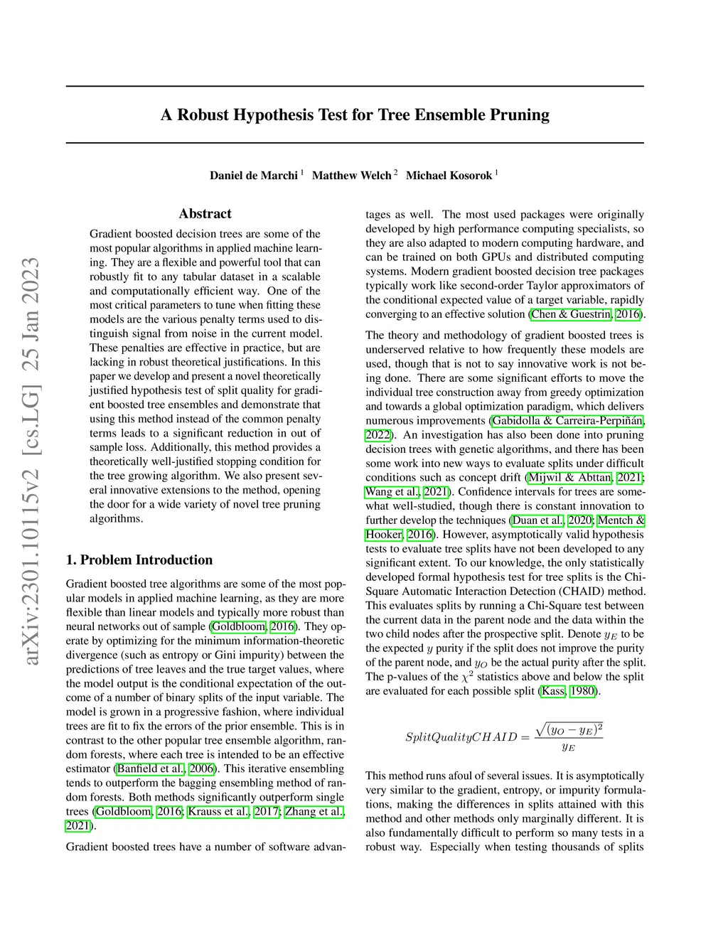 Gradient boosted decision trees are some of the most popular algorithms in applied machine learning. They are a flexible and powerful tool that can robustly fit to any tabular dataset in a scalable and computationally efficient way. One of the most critical parameters to tune when fitting these models are the various penalty terms used to distinguish signal from noise in the current model. These penalties are effective in practice, but are lacking in robust theoretical justifications. In this paper we develop and present a novel theoretically justified hypothesis test of split quality for gradient boosted tree ensembles and demonstrate that using this method instead of the common penalty terms leads to a significant reduction in out of sample loss. Additionally, this method provides a theoretically well-justified stopping condition for the tree growing algorithm. We also present several innovative extensions to the method, opening the door for a wide variety of novel tree pruning algorithms.