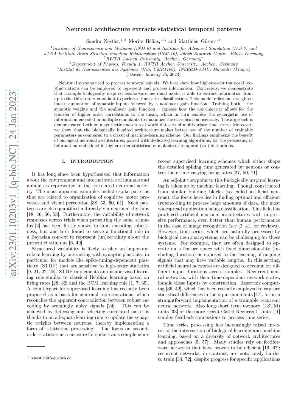 Neuronal systems need to process temporal signals. We here show how higher-order temporal (co-)fluctuations can be employed to represent and process information. Concretely, we demonstrate that a simple biologically inspired feedforward neuronal model is able to extract information from up to the third order cumulant to perform time series classification. This model relies on a weighted linear summation of synaptic inputs followed by a nonlinear gain function. Training both - the synaptic weights and the nonlinear gain function - exposes how the non-linearity allows for the transfer of higher order correlations to the mean, which in turn enables the synergistic use of information encoded in multiple cumulants to maximize the classification accuracy. The approach is demonstrated both on a synthetic and on real world datasets of multivariate time series. Moreover, we show that the biologically inspired architecture makes better use of the number of trainable parameters as compared to a classical machine-learning scheme. Our findings emphasize the benefit of biological neuronal architectures, paired with dedicated learning algorithms, for the processing of information embedded in higher-order statistical cumulants of temporal (co-)fluctuations.