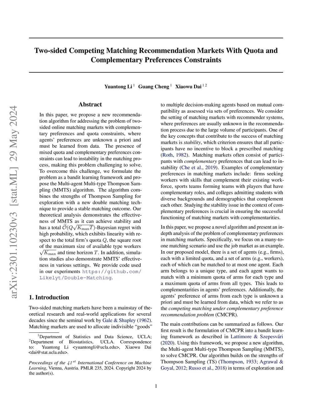 In this paper, we propose a new algorithm for addressing the problem of matching markets with complementary preferences, where agents' preferences are unknown a priori and must be learned from data. The presence of complementary preferences can lead to instability in the matching process, making this problem challenging to solve. To overcome this challenge, we formulate the problem as a bandit learning framework and propose the Multi-agent Multi-type Thompson Sampling (MMTS) algorithm. The algorithm combines the strengths of Thompson Sampling for exploration with a double matching technique to achieve a stable matching outcome. Our theoretical analysis demonstrates the effectiveness of MMTS as it is able to achieve stability at every matching step, satisfies the incentive-compatibility property, and has a sublinear Bayesian regret over time. Our approach provides a useful method for addressing complementary preferences in real-world scenarios.