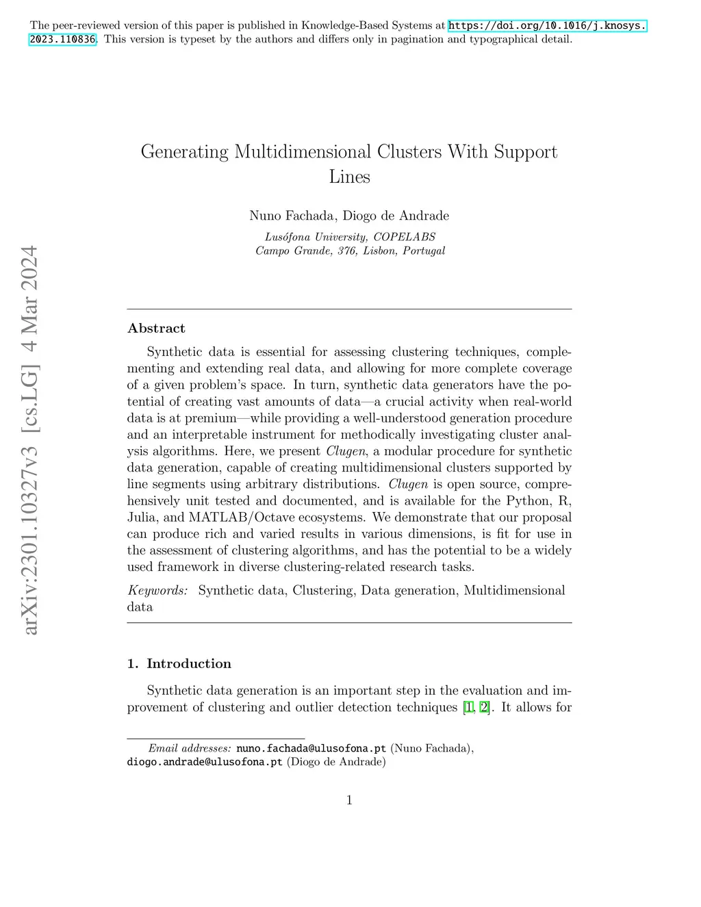 Synthetic data is essential for assessing clustering techniques, complementing and extending real data, and allowing for more complete coverage of a given problem's space. In turn, synthetic data generators have the potential of creating vast amounts of data -- a crucial activity when real-world data is at premium -- while providing a well-understood generation procedure and an interpretable instrument for methodically investigating cluster analysis algorithms. Here, we present Clugen, a modular procedure for synthetic data generation, capable of creating multidimensional clusters supported by line segments using arbitrary distributions. Clugen is open source, comprehensively unit tested and documented, and is available for the Python, R, Julia, and MATLAB/Octave ecosystems. We demonstrate that our proposal can produce rich and varied results in various dimensions, is fit for use in the assessment of clustering algorithms, and has the potential to be a widely used framework in diverse clustering-related research tasks.