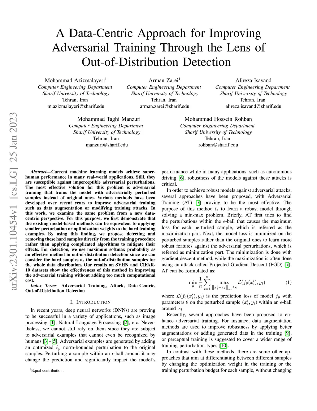 Current machine learning models achieve super-human performance in many real-world applications. Still, they are susceptible against imperceptible adversarial perturbations. The most effective solution for this problem is adversarial training that trains the model with adversarially perturbed samples instead of original ones. Various methods have been developed over recent years to improve adversarial training such as data augmentation or modifying training attacks. In this work, we examine the same problem from a new data-centric perspective. For this purpose, we first demonstrate that the existing model-based methods can be equivalent to applying smaller perturbation or optimization weights to the hard training examples. By using this finding, we propose detecting and removing these hard samples directly from the training procedure rather than applying complicated algorithms to mitigate their effects. For detection, we use maximum softmax probability as an effective method in out-of-distribution detection since we can consider the hard samples as the out-of-distribution samples for the whole data distribution. Our results on SVHN and CIFAR-10 datasets show the effectiveness of this method in improving the adversarial training without adding too much computational cost.