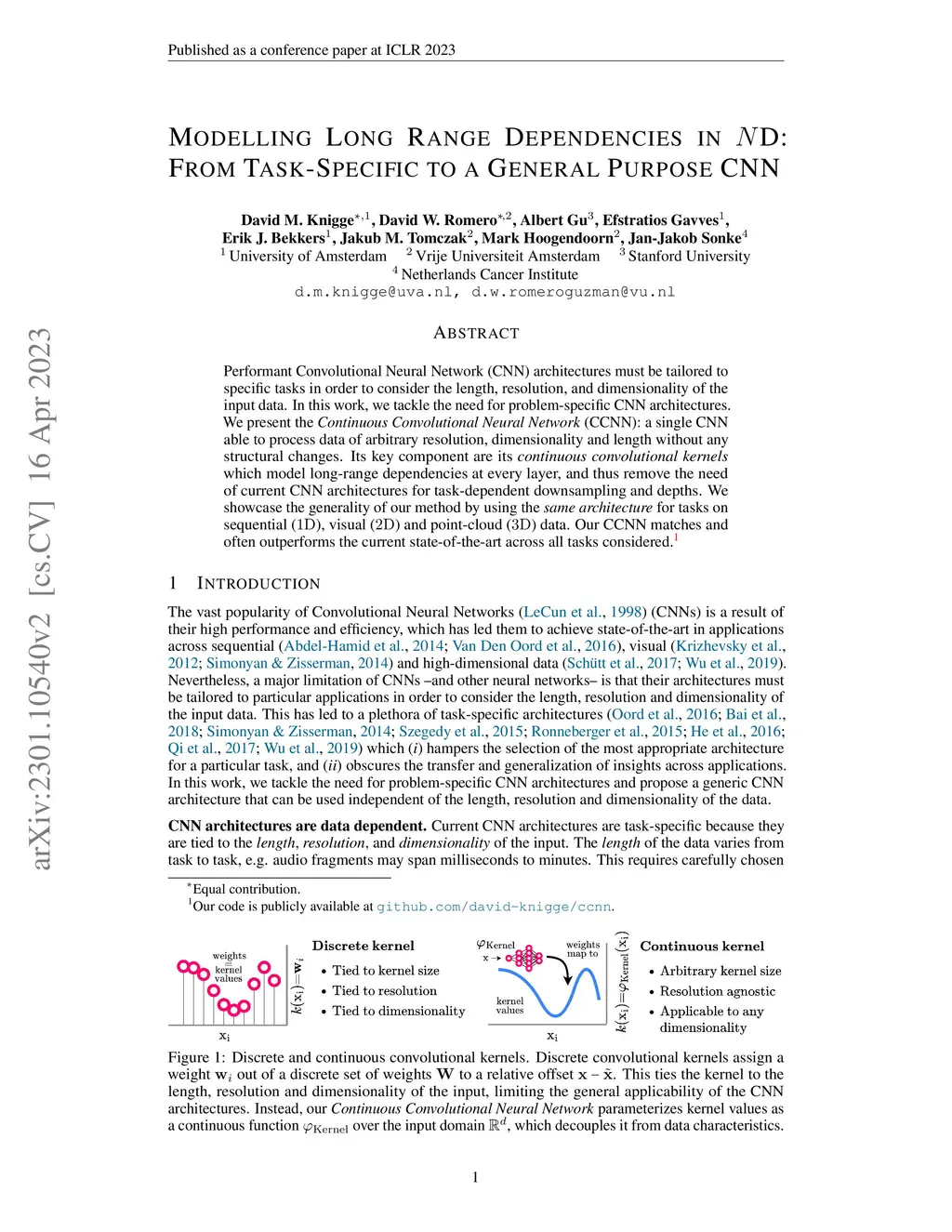 Performant Convolutional Neural Network (CNN) architectures must be tailored to specific tasks in order to consider the length, resolution, and dimensionality of the input data. In this work, we tackle the need for problem-specific CNN architectures. We present the Continuous Convolutional Neural Network (CCNN): a single CNN able to process data of arbitrary resolution, dimensionality and length without any structural changes. Its key component are its continuous convolutional kernels which model long-range dependencies at every layer, and thus remove the need of current CNN architectures for task-dependent downsampling and depths. We showcase the generality of our method by using the same architecture for tasks on sequential (), visual () and point-cloud () data. Our CCNN matches and often outperforms the current state-of-the-art across all tasks considered.