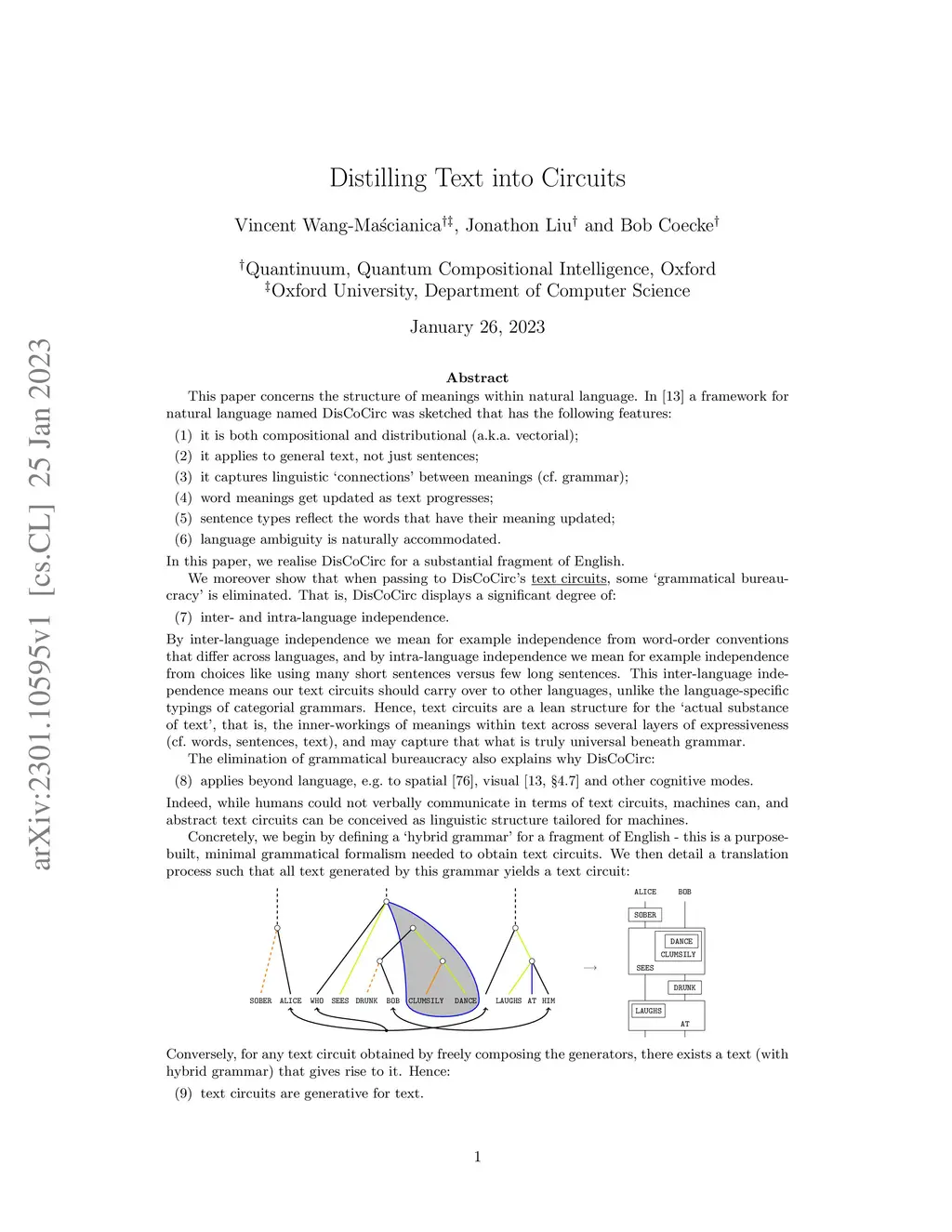 This paper concerns the structure of meanings within natural language. Earlier, a framework named DisCoCirc was sketched that (1) is compositional and distributional (a.k.a. vectorial); (2) applies to general text; (3) captures linguistic `connections' between meanings (cf. grammar) (4) updates word meanings as text progresses; (5) structures sentence types; (6) accommodates ambiguity. Here, we realise DisCoCirc for a substantial fragment of English. When passing to DisCoCirc's text circuits, some `grammatical bureaucracy' is eliminated, that is, DisCoCirc displays a significant degree of (7) inter- and intra-language independence. That is, e.g., independence from word-order conventions that differ across languages, and independence from choices like many short sentences vs. few long sentences. This inter-language independence means our text circuits should carry over to other languages, unlike the language-specific typings of categorial grammars. Hence, text circuits are a lean structure for the `actual substance of text', that is, the inner-workings of meanings within text across several layers of expressiveness (cf. words, sentences, text), and may capture that what is truly universal beneath grammar. The elimination of grammatical bureaucracy also explains why DisCoCirc: (8) applies beyond language, e.g. to spatial, visual and other cognitive modes. While humans could not verbally communicate in terms of text circuits, machines can. We first define a `hybrid grammar' for a fragment of English, i.e. a purpose-built, minimal grammatical formalism needed to obtain text circuits. We then detail a translation process such that all text generated by this grammar yields a text circuit. Conversely, for any text circuit obtained by freely composing the generators, there exists a text (with hybrid grammar) that gives rise to it. Hence: (9) text circuits are generative for text.