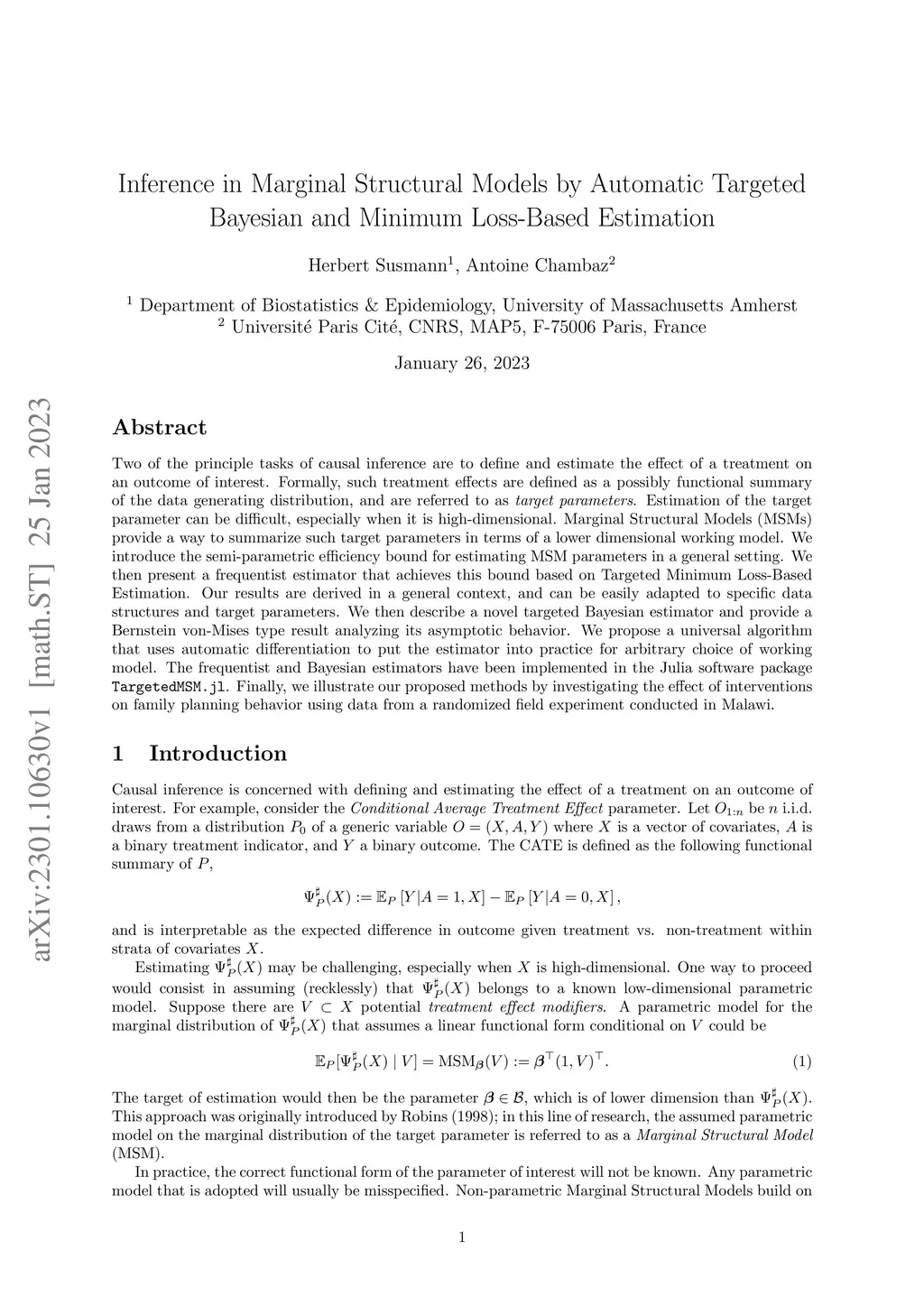 Two of the principle tasks of causal inference are to define and estimate the effect of a treatment on an outcome of interest. Formally, such treatment effects are defined as a possibly functional summary of the data generating distribution, and are referred to as target parameters. Estimation of the target parameter can be difficult, especially when it is high-dimensional. Marginal Structural Models (MSMs) provide a way to summarize such target parameters in terms of a lower dimensional working model. We introduce the semi-parametric efficiency bound for estimating MSM parameters in a general setting. We then present a frequentist estimator that achieves this bound based on Targeted Minimum Loss-Based Estimation. Our results are derived in a general context, and can be easily adapted to specific data structures and target parameters. We then describe a novel targeted Bayesian estimator and provide a Bernstein von-Mises type result analyzing its asymptotic behavior. We propose a universal algorithm that uses automatic differentiation to put the estimator into practice for arbitrary choice of working model. The frequentist and Bayesian estimators have been implemented in the Julia software package TargetedMSM.jl. Finally, we illustrate our proposed methods by investigating the effect of interventions on family planning behavior using data from a randomized field experiment conducted in Malawi.
