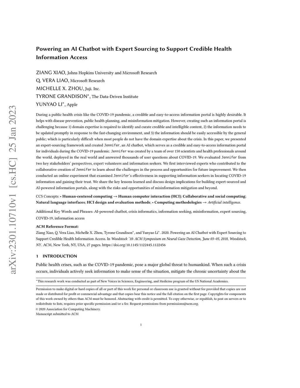 During a public health crisis like the COVID-19 pandemic, a credible and easy-to-access information portal is highly desirable. It helps with disease prevention, public health planning, and misinformation mitigation. However, creating such an information portal is challenging because 1) domain expertise is required to identify and curate credible and intelligible content, 2) the information needs to be updated promptly in response to the fast-changing environment, and 3) the information should be easily accessible by the general public; which is particularly difficult when most people do not have the domain expertise about the crisis. In this paper, we presented an expert-sourcing framework and created Jennifer, an AI chatbot, which serves as a credible and easy-to-access information portal for individuals during the COVID-19 pandemic. Jennifer was created by a team of over 150 scientists and health professionals around the world, deployed in the real world and answered thousands of user questions about COVID-19. We evaluated Jennifer from two key stakeholders' perspectives, expert volunteers and information seekers. We first interviewed experts who contributed to the collaborative creation of Jennifer to learn about the challenges in the process and opportunities for future improvement. We then conducted an online experiment that examined Jennifer's effectiveness in supporting information seekers in locating COVID-19 information and gaining their trust. We share the key lessons learned and discuss design implications for building expert-sourced and AI-powered information portals, along with the risks and opportunities of misinformation mitigation and beyond.