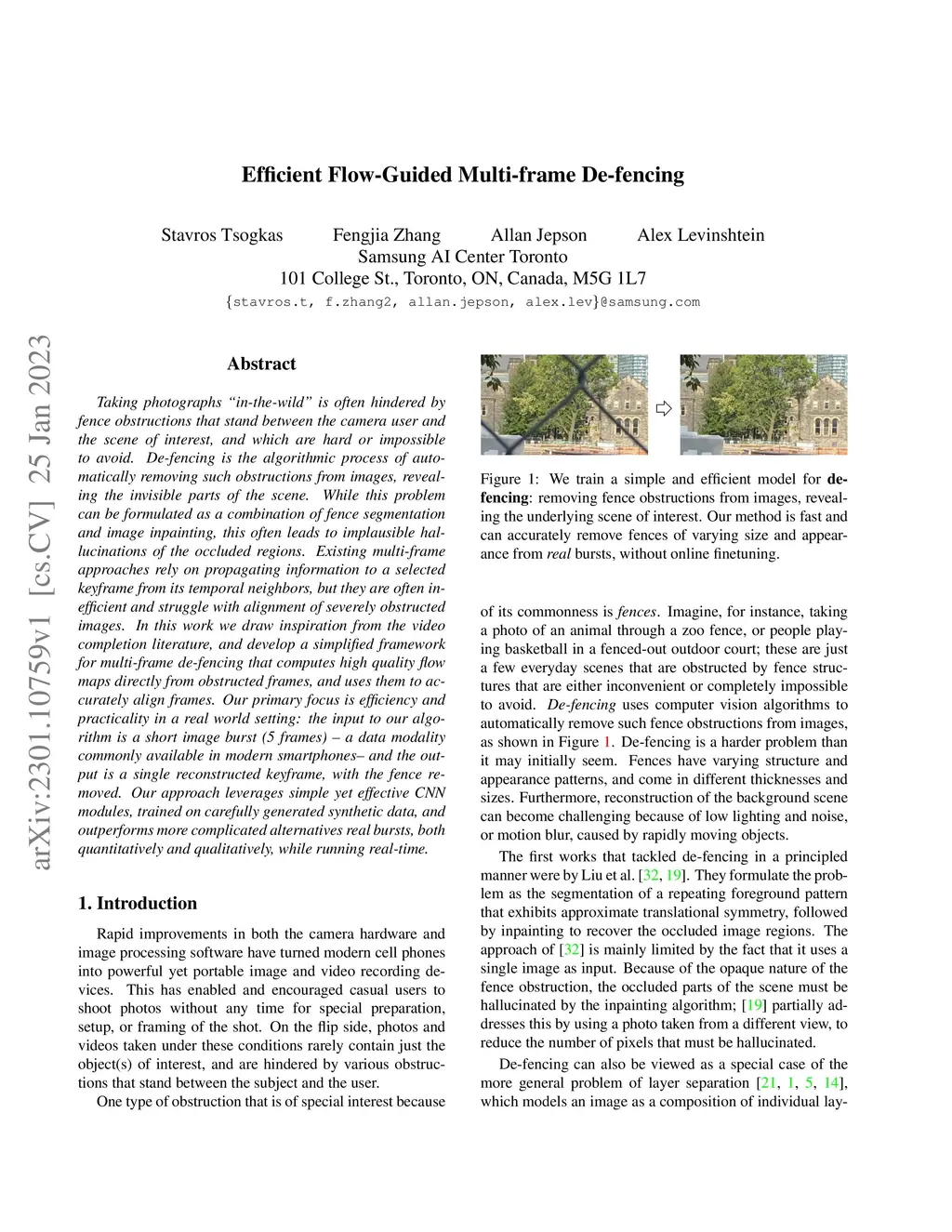 Efficient Flow-Guided Multi-frame De-fencing