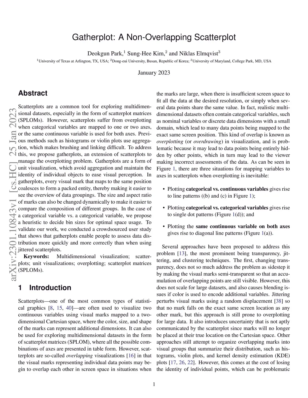 Scatterplots are a common tool for exploring multidimensional datasets, especially in the form of scatterplot matrices (SPLOMs). However, scatterplots suffer from overplotting when categorical variables are mapped to one or two axes, or the same continuous variable is used for both axes. Previous methods such as histograms or violin plots use aggregation, which makes brushing and linking difficult. To address this, we propose gatherplots, an extension of scatterplots to manage the overplotting problem. Gatherplots are a form of unit visualization, which avoid aggregation and maintain the identity of individual objects to ease visual perception. In gatherplots, every visual mark that maps to the same position coalesces to form a packed entity, thereby making it easier to see the overview of data groupings. The size and aspect ratio of marks can also be changed dynamically to make it easier to compare the composition of different groups. In the case of a categorical variable vs. a categorical variable, we propose a heuristic to decide bin sizes for optimal space usage. To validate our work, we conducted a crowdsourced user study that shows that gatherplots enable people to assess data distribution more quickly and more correctly than when using jittered scatterplots.