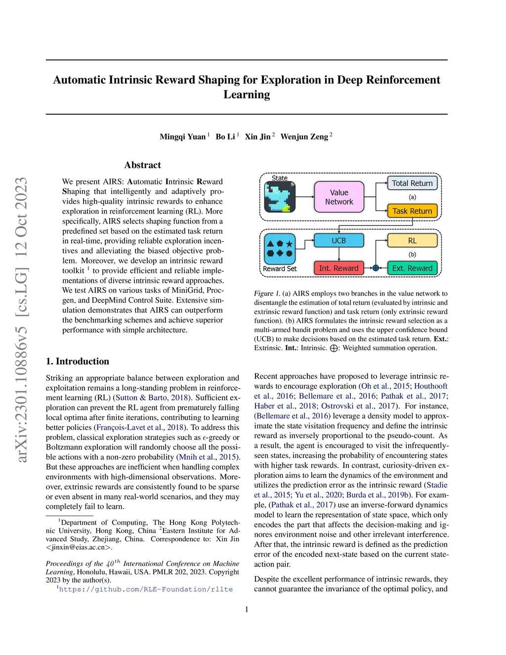 We present AIRS: Automatic Intrinsic Reward Shaping that intelligently and adaptively provides high-quality intrinsic rewards to enhance exploration in reinforcement learning (RL). More specifically, AIRS selects shaping function from a predefined set based on the estimated task return in real-time, providing reliable exploration incentives and alleviating the biased objective problem. Moreover, we develop an intrinsic reward toolkit to provide efficient and reliable implementations of diverse intrinsic reward approaches. We test AIRS on various tasks of MiniGrid, Procgen, and DeepMind Control Suite. Extensive simulation demonstrates that AIRS can outperform the benchmarking schemes and achieve superior performance with simple architecture.