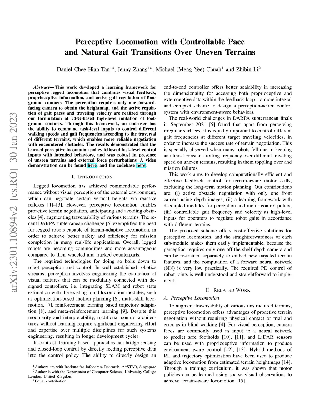 This work developed a learning framework for perceptive legged locomotion that combines visual feedback, proprioceptive information, and active gait regulation of foot-ground contacts. The perception requires only one forward-facing camera to obtain the heightmap, and the active regulation of gait paces and traveling velocity are realized through our formulation of CPG-based high-level imitation of foot-ground contacts. Through this framework, an end-user has the ability to command task-level inputs to control different walking speeds and gait frequencies according to the traversal of different terrains, which enables more reliable negotiation with encountered obstacles. The results demonstrated that the learned perceptive locomotion policy followed task-level control inputs with intended behaviors, and was robust in presence of unseen terrains and external force perturbations. A video demonstration can be found at https://youtu.be/OTzlWzDfAe8, and the codebase at https://github.com/jennyzzt/perceptual-locomotion.