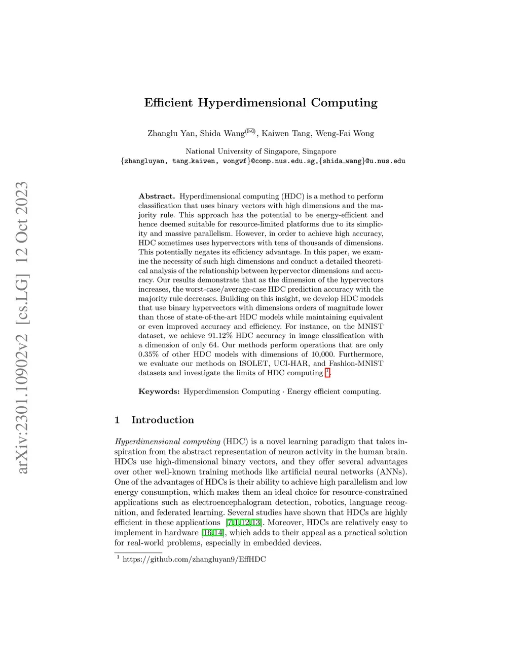 Hyperdimensional computing (HDC) is a method to perform classification that uses binary vectors with high dimensions and the majority rule. This approach has the potential to be energy-efficient and hence deemed suitable for resource-limited platforms due to its simplicity and massive parallelism. However, in order to achieve high accuracy, HDC sometimes uses hypervectors with tens of thousands of dimensions. This potentially negates its efficiency advantage. In this paper, we examine the necessity of such high dimensions and conduct a detailed theoretical analysis of the relationship between hypervector dimensions and accuracy. Our results demonstrate that as the dimension of the hypervectors increases, the worst-case/average-case HDC prediction accuracy with the majority rule decreases. Building on this insight, we develop HDC models that use binary hypervectors with dimensions orders of magnitude lower than those of state-of-the-art HDC models while maintaining equivalent or even improved accuracy and efficiency. For instance, on the MNIST dataset, we achieve 91.12% HDC accuracy in image classification with a dimension of only 64. Our methods perform operations that are only 0.35% of other HDC models with dimensions of 10,000. Furthermore, we evaluate our methods on ISOLET, UCI-HAR, and Fashion-MNIST datasets and investigate the limits of HDC computing.
