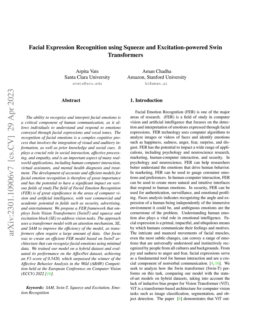 The ability to recognize and interpret facial emotions is a critical component of human communication, as it allows individuals to understand and respond to emotions conveyed through facial expressions and vocal tones. The recognition of facial emotions is a complex cognitive process that involves the integration of visual and auditory information, as well as prior knowledge and social cues. It plays a crucial role in social interaction, affective processing, and empathy, and is an important aspect of many real-world applications, including human-computer interaction, virtual assistants, and mental health diagnosis and treatment. The development of accurate and efficient models for facial emotion recognition is therefore of great importance and has the potential to have a significant impact on various fields of study.The field of Facial Emotion Recognition (FER) is of great significance in the areas of computer vision and artificial intelligence, with vast commercial and academic potential in fields such as security, advertising, and entertainment. We propose a FER framework that employs Swin Vision Transformers (SwinT) and squeeze and excitation block (SE) to address vision tasks. The approach uses a transformer model with an attention mechanism, SE, and SAM to improve the efficiency of the model, as transformers often require a large amount of data. Our focus was to create an efficient FER model based on SwinT architecture that can recognize facial emotions using minimal data. We trained our model on a hybrid dataset and evaluated its performance on the AffectNet dataset, achieving an F1-score of 0.5420, which surpassed the winner of the Affective Behavior Analysis in the Wild (ABAW) Competition held at the European Conference on Computer Vision (ECCV) 2022~\cite{Kollias}.