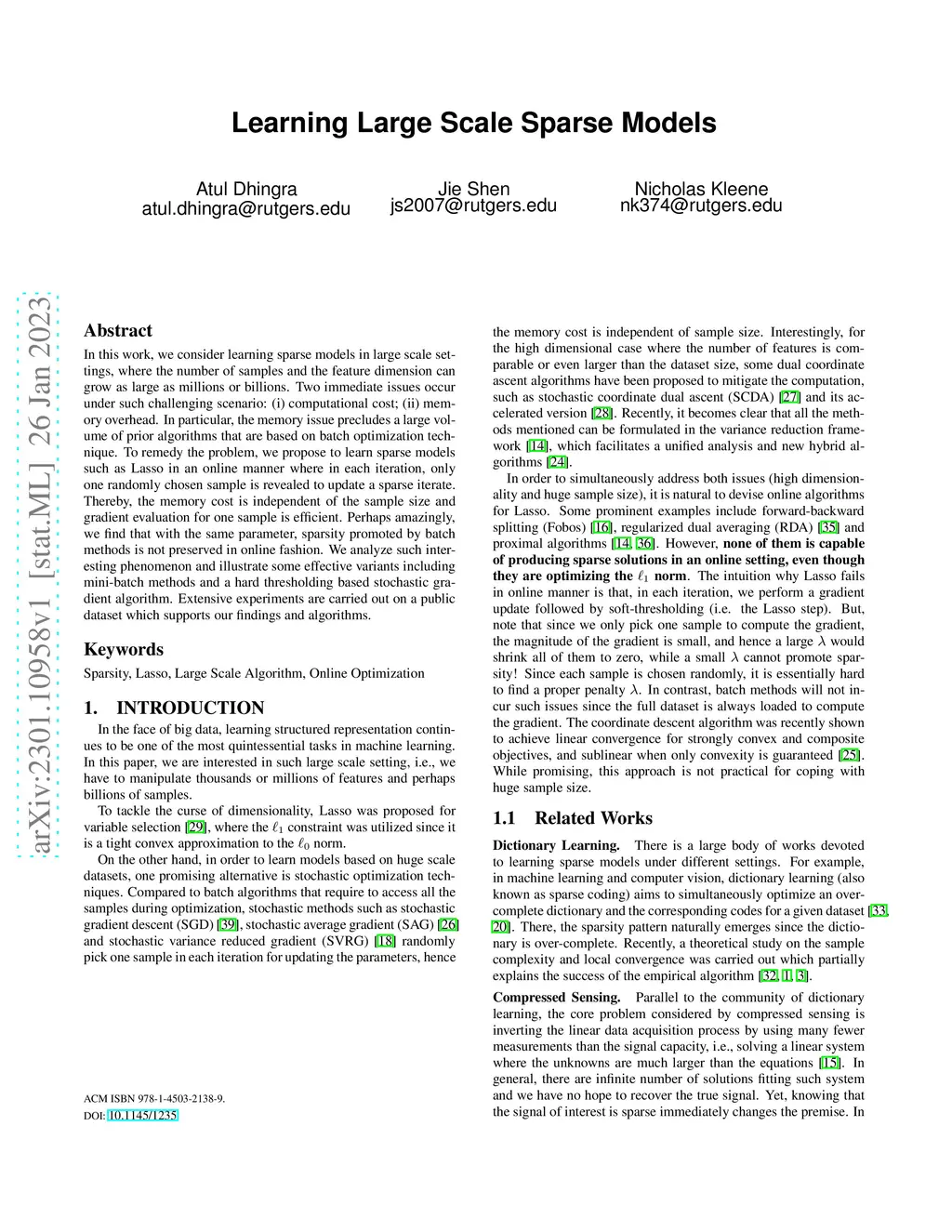 In this work, we consider learning sparse models in large scale settings, where the number of samples and the feature dimension can grow as large as millions or billions. Two immediate issues occur under such challenging scenario: (i) computational cost; (ii) memory overhead. In particular, the memory issue precludes a large volume of prior algorithms that are based on batch optimization technique. To remedy the problem, we propose to learn sparse models such as Lasso in an online manner where in each iteration, only one randomly chosen sample is revealed to update a sparse iterate. Thereby, the memory cost is independent of the sample size and gradient evaluation for one sample is efficient. Perhaps amazingly, we find that with the same parameter, sparsity promoted by batch methods is not preserved in online fashion. We analyze such interesting phenomenon and illustrate some effective variants including mini-batch methods and a hard thresholding based stochastic gradient algorithm. Extensive experiments are carried out on a public dataset which supports our findings and algorithms.