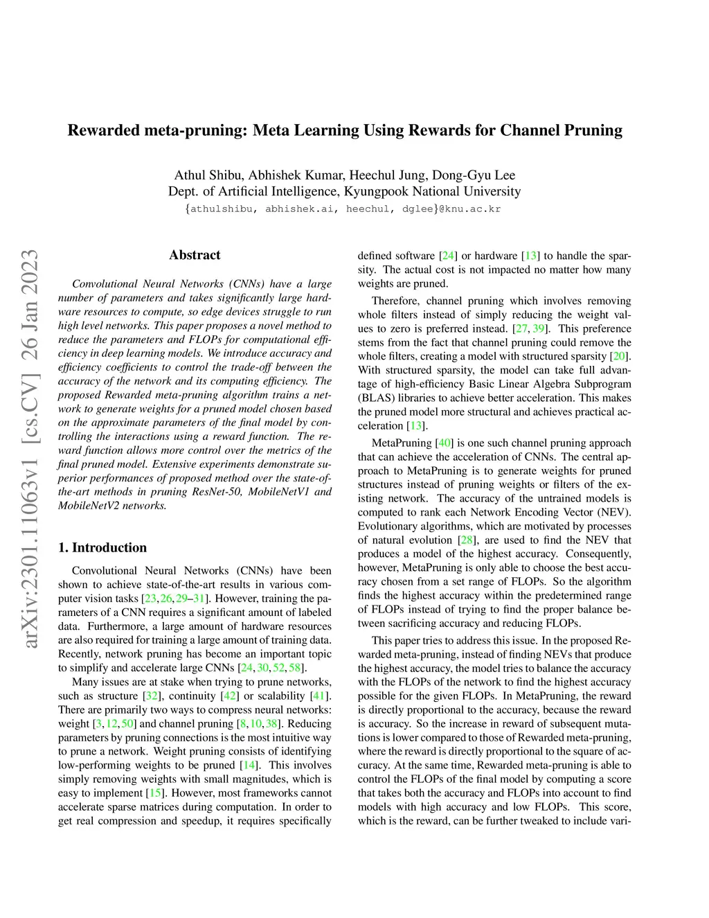 Rewarded meta-pruning: Meta Learning with Rewards for Channel Pruning