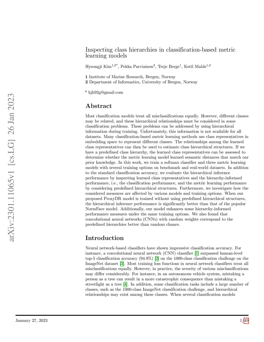 Most classification models treat all misclassifications equally. However, different classes may be related, and these hierarchical relationships must be considered in some classification problems. These problems can be addressed by using hierarchical information during training. Unfortunately, this information is not available for all datasets. Many classification-based metric learning methods use class representatives in embedding space to represent different classes. The relationships among the learned class representatives can then be used to estimate class hierarchical structures. If we have a predefined class hierarchy, the learned class representatives can be assessed to determine whether the metric learning model learned semantic distances that match our prior knowledge. In this work, we train a softmax classifier and three metric learning models with several training options on benchmark and real-world datasets. In addition to the standard classification accuracy, we evaluate the hierarchical inference performance by inspecting learned class representatives and the hierarchy-informed performance, i.e., the classification performance, and the metric learning performance by considering predefined hierarchical structures. Furthermore, we investigate how the considered measures are affected by various models and training options. When our proposed ProxyDR model is trained without using predefined hierarchical structures, the hierarchical inference performance is significantly better than that of the popular NormFace model. Additionally, our model enhances some hierarchy-informed performance measures under the same training options. We also found that convolutional neural networks (CNNs) with random weights correspond to the predefined hierarchies better than random chance.