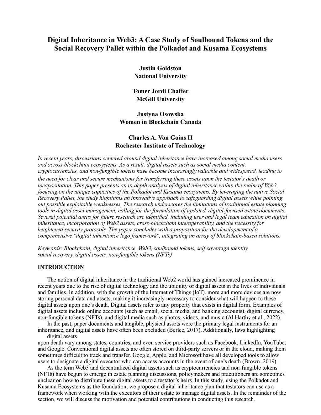 In recent years discussions centered around digital inheritance have increased among social media users and across blockchain ecosystems. As a result digital assets such as social media content cryptocurrencies and non-fungible tokens have become increasingly valuable and widespread, leading to the need for clear and secure mechanisms for transferring these assets upon the testators death or incapacitation. This study proposes a framework for digital inheritance using soulbound tokens and the social recovery pallet as a use case in the Polkadot and Kusama blockchain networks. The findings discussed within this study suggest that while soulbound tokens and the social recovery pallet offer a promising solution for creating a digital inheritance plan the findings also raise important considerations for testators digital executors and developers. While further research is needed to fully understand the potential impacts and risks of other technologies such as artificial intelligence and quantum computing this study provides a primer for users to begin planning a digital inheritance strategy and for developers to develop a more intuitive solution.