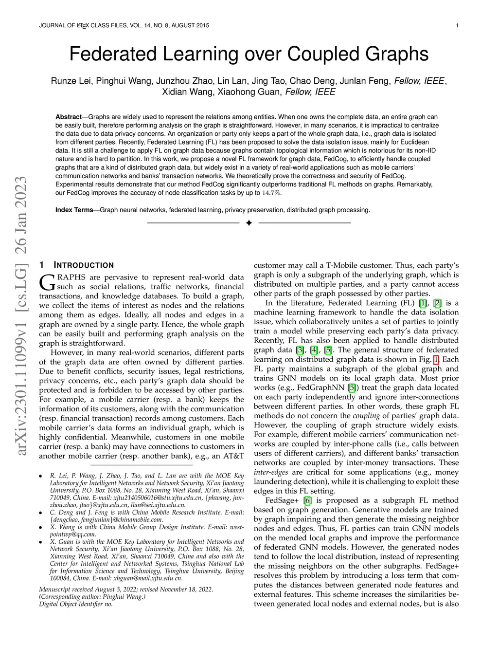 Graphs are widely used to represent the relations among entities. When one owns the complete data, an entire graph can be easily built, therefore performing analysis on the graph is straightforward. However, in many scenarios, it is impractical to centralize the data due to data privacy concerns. An organization or party only keeps a part of the whole graph data, i.e., graph data is isolated from different parties. Recently, Federated Learning (FL) has been proposed to solve the data isolation issue, mainly for Euclidean data. It is still a challenge to apply FL on graph data because graphs contain topological information which is notorious for its non-IID nature and is hard to partition. In this work, we propose a novel FL framework for graph data, FedCog, to efficiently handle coupled graphs that are a kind of distributed graph data, but widely exist in a variety of real-world applications such as mobile carriers' communication networks and banks' transaction networks. We theoretically prove the correctness and security of FedCog. Experimental results demonstrate that our method FedCog significantly outperforms traditional FL methods on graphs. Remarkably, our FedCog improves the accuracy of node classification tasks by up to 14.7%.
