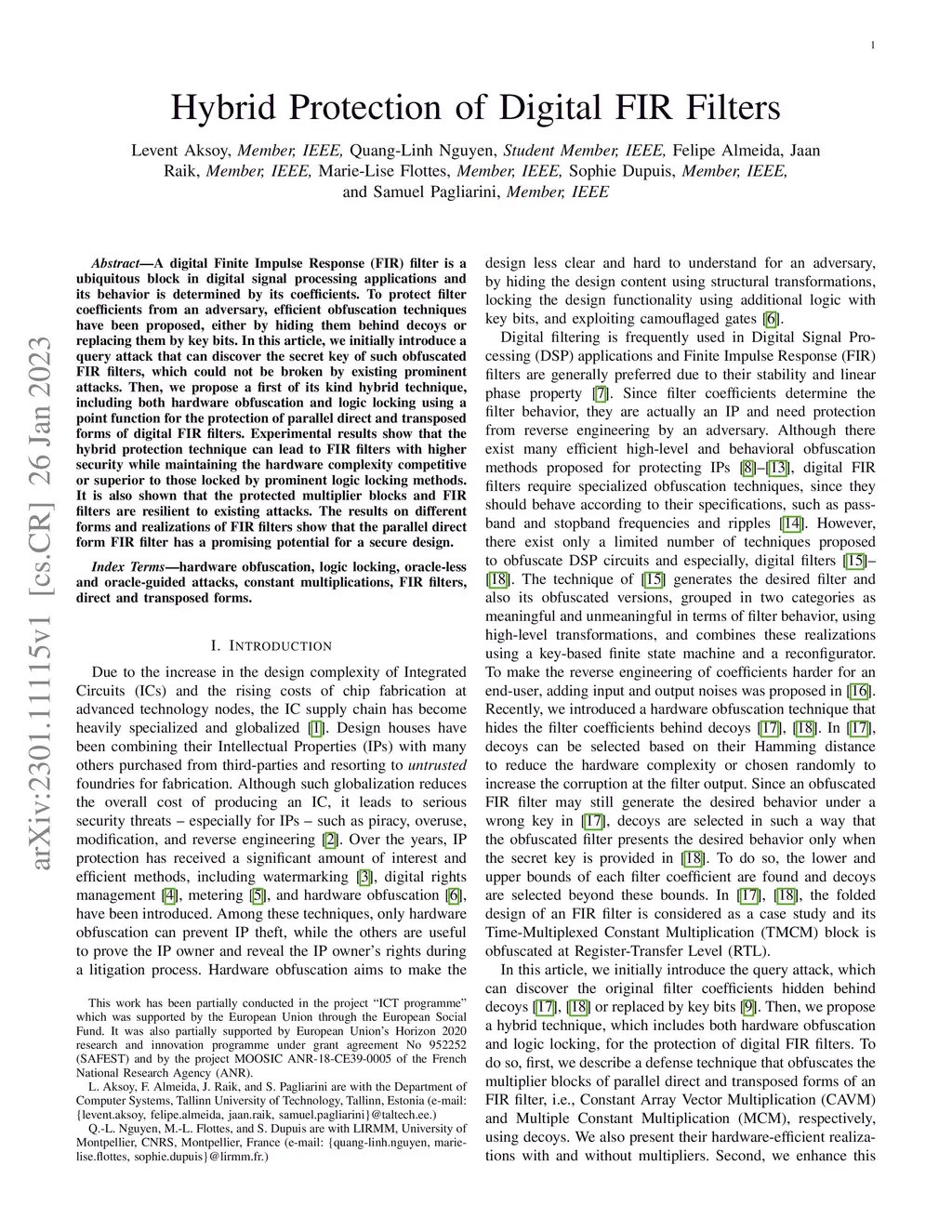 A digital Finite Impulse Response (FIR) filter is a ubiquitous block in digital signal processing applications and its behavior is determined by its coefficients. To protect filter coefficients from an adversary, efficient obfuscation techniques have been proposed, either by hiding them behind decoys or replacing them by key bits. In this article, we initially introduce a query attack that can discover the secret key of such obfuscated FIR filters, which could not be broken by existing prominent attacks. Then, we propose a first of its kind hybrid technique, including both hardware obfuscation and logic locking using a point function for the protection of parallel direct and transposed forms of digital FIR filters. Experimental results show that the hybrid protection technique can lead to FIR filters with higher security while maintaining the hardware complexity competitive or superior to those locked by prominent logic locking methods. It is also shown that the protected multiplier blocks and FIR filters are resilient to existing attacks. The results on different forms and realizations of FIR filters show that the parallel direct form FIR filter has a promising potential for a secure design.
