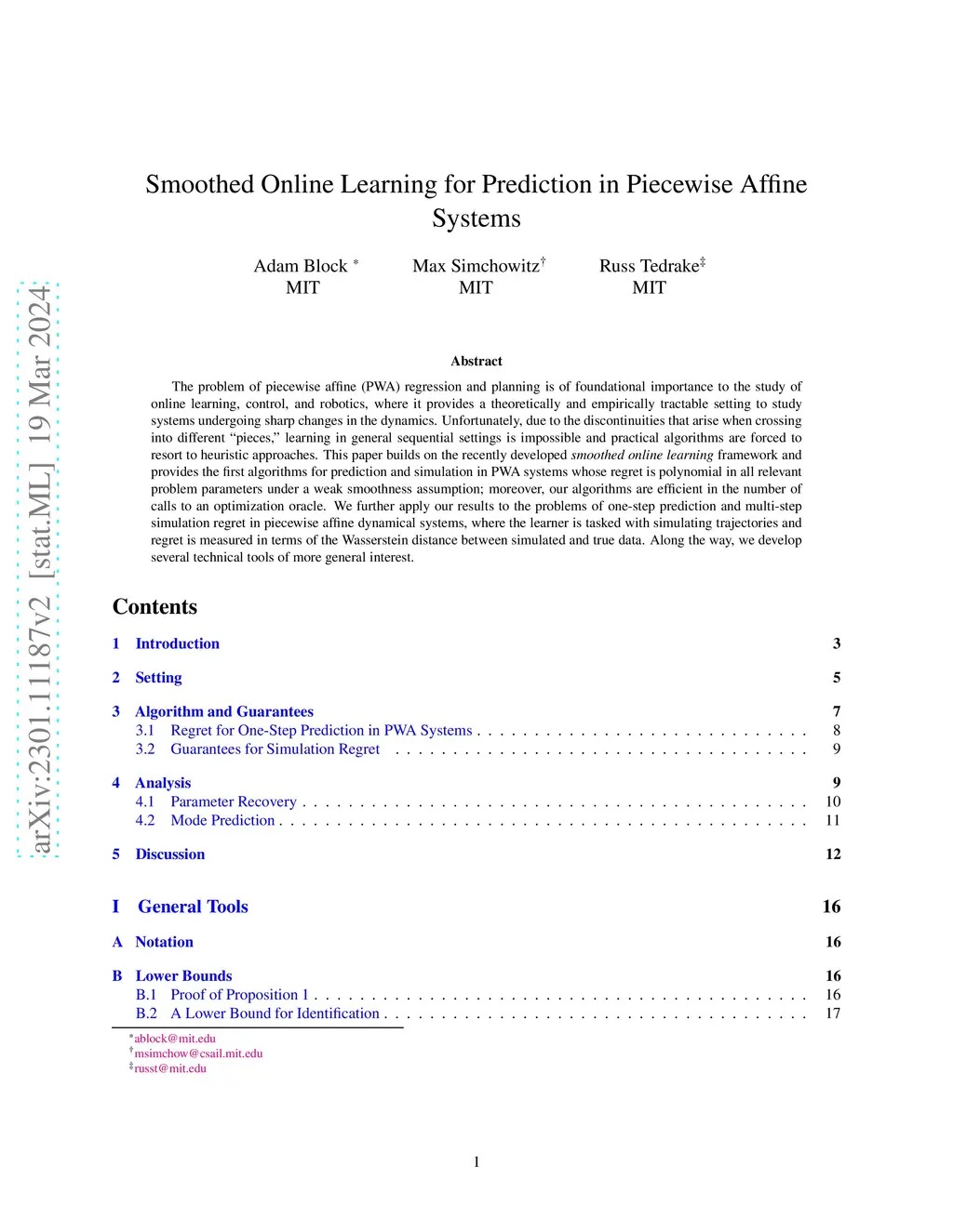 The problem of piecewise affine (PWA) regression and planning is of foundational importance to the study of online learning, control, and robotics, where it provides a theoretically and empirically tractable setting to study systems undergoing sharp changes in the dynamics. Unfortunately, due to the discontinuities that arise when crossing into different ``pieces,'' learning in general sequential settings is impossible and practical algorithms are forced to resort to heuristic approaches. This paper builds on the recently developed smoothed online learning framework and provides the first algorithms for prediction and simulation in PWA systems whose regret is polynomial in all relevant problem parameters under a weak smoothness assumption; moreover, our algorithms are efficient in the number of calls to an optimization oracle. We further apply our results to the problems of one-step prediction and multi-step simulation regret in piecewise affine dynamical systems, where the learner is tasked with simulating trajectories and regret is measured in terms of the Wasserstein distance between simulated and true data. Along the way, we develop several technical tools of more general interest.