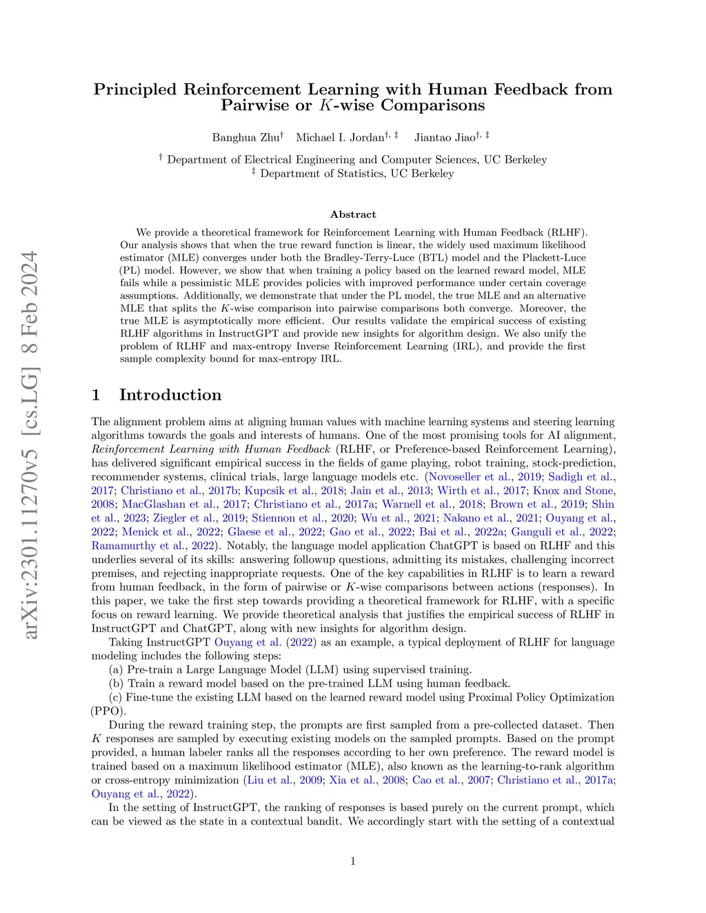We provide a theoretical framework for Reinforcement Learning with Human Feedback (RLHF). Our analysis shows that when the true reward function is linear, the widely used maximum likelihood estimator (MLE) converges under both the Bradley-Terry-Luce (BTL) model and the Plackett-Luce (PL) model. However, we show that when training a policy based on the learned reward model, MLE fails while a pessimistic MLE provides policies with improved performance under certain coverage assumptions. Additionally, we demonstrate that under the PL model, the true MLE and an alternative MLE that splits the -wise comparison into pairwise comparisons both converge. Moreover, the true MLE is asymptotically more efficient. Our results validate the empirical success of existing RLHF algorithms in InstructGPT and provide new insights for algorithm design. Furthermore, our results unify the problem of RLHF and max-entropy Inverse Reinforcement Learning (IRL), and provide the first sample complexity bound for max-entropy IRL.