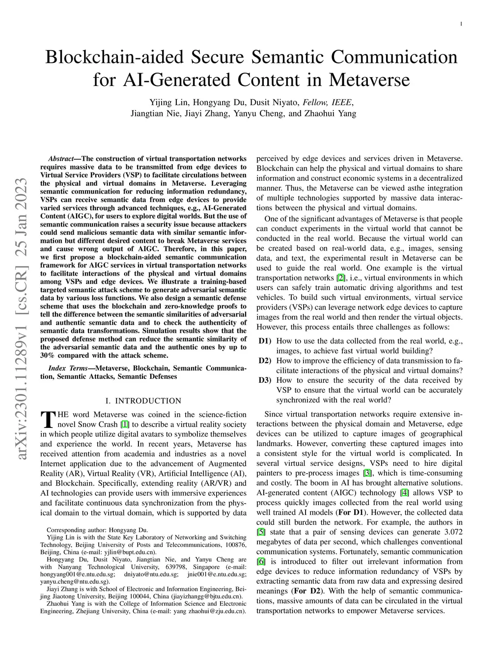 The construction of virtual transportation networks requires massive data to be transmitted from edge devices to Virtual Service Providers (VSP) to facilitate circulations between the physical and virtual domains in Metaverse. Leveraging semantic communication for reducing information redundancy, VSPs can receive semantic data from edge devices to provide varied services through advanced techniques, e.g., AI-Generated Content (AIGC), for users to explore digital worlds. But the use of semantic communication raises a security issue because attackers could send malicious semantic data with similar semantic information but different desired content to break Metaverse services and cause wrong output of AIGC. Therefore, in this paper, we first propose a blockchain-aided semantic communication framework for AIGC services in virtual transportation networks to facilitate interactions of the physical and virtual domains among VSPs and edge devices. We illustrate a training-based targeted semantic attack scheme to generate adversarial semantic data by various loss functions. We also design a semantic defense scheme that uses the blockchain and zero-knowledge proofs to tell the difference between the semantic similarities of adversarial and authentic semantic data and to check the authenticity of semantic data transformations. Simulation results show that the proposed defense method can reduce the semantic similarity of the adversarial semantic data and the authentic ones by up to 30% compared with the attack scheme.