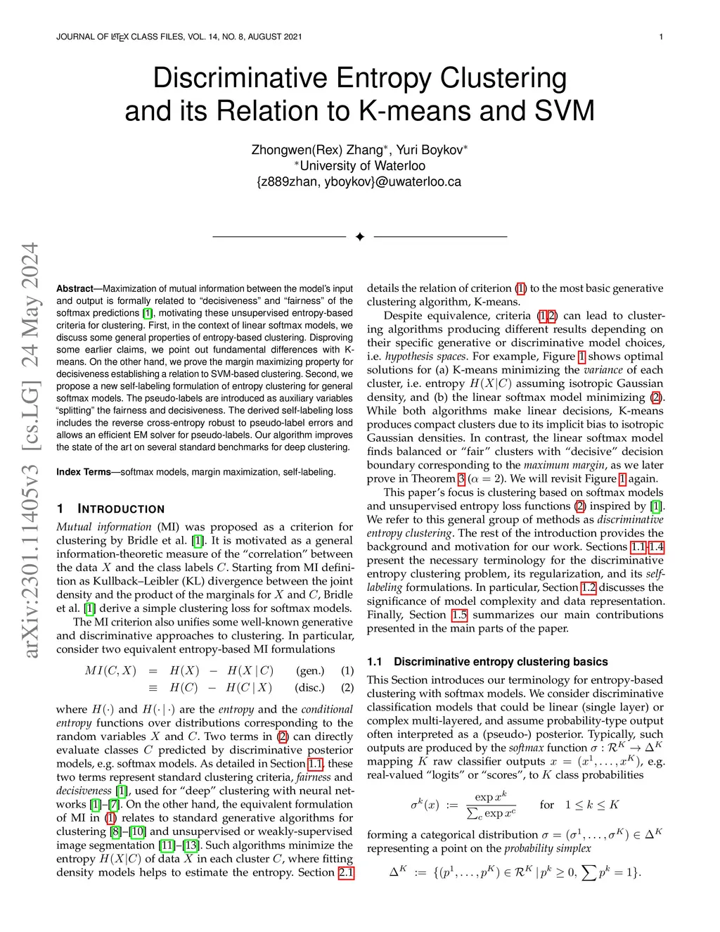 Maximization of mutual information between the model's input and output is formally related to "decisiveness" and "fairness" of the softmax predictions, motivating these unsupervised entropy-based criteria for clustering. First, in the context of linear softmax models, we discuss some general properties of entropy-based clustering. Disproving some earlier claims, we point out fundamental differences with K-means. On the other hand, we prove the margin maximizing property for decisiveness establishing a relation to SVM-based clustering. Second, we propose a new self-labeling formulation of entropy clustering for general softmax models. The pseudo-labels are introduced as auxiliary variables "splitting" the fairness and decisiveness. The derived self-labeling loss includes the reverse cross-entropy robust to pseudo-label errors and allows an efficient EM solver for pseudo-labels. Our algorithm improves the state of the art on several standard benchmarks for deep clustering.