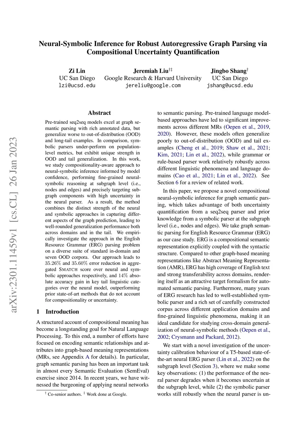 Pre-trained seq2seq models excel at graph semantic parsing with rich annotated data, but generalize worse to out-of-distribution (OOD) and long-tail examples. In comparison, symbolic parsers under-perform on population-level metrics, but exhibit unique strength in OOD and tail generalization. In this work, we study compositionality-aware approach to neural-symbolic inference informed by model confidence, performing fine-grained neural-symbolic reasoning at subgraph level (i.e., nodes and edges) and precisely targeting subgraph components with high uncertainty in the neural parser. As a result, the method combines the distinct strength of the neural and symbolic approaches in capturing different aspects of the graph prediction, leading to well-rounded generalization performance both across domains and in the tail. We empirically investigate the approach in the English Resource Grammar (ERG) parsing problem on a diverse suite of standard in-domain and seven OOD corpora. Our approach leads to 35.26% and 35.60% error reduction in aggregated Smatch score over neural and symbolic approaches respectively, and 14% absolute accuracy gain in key tail linguistic categories over the neural model, outperforming prior state-of-art methods that do not account for compositionality or uncertainty.