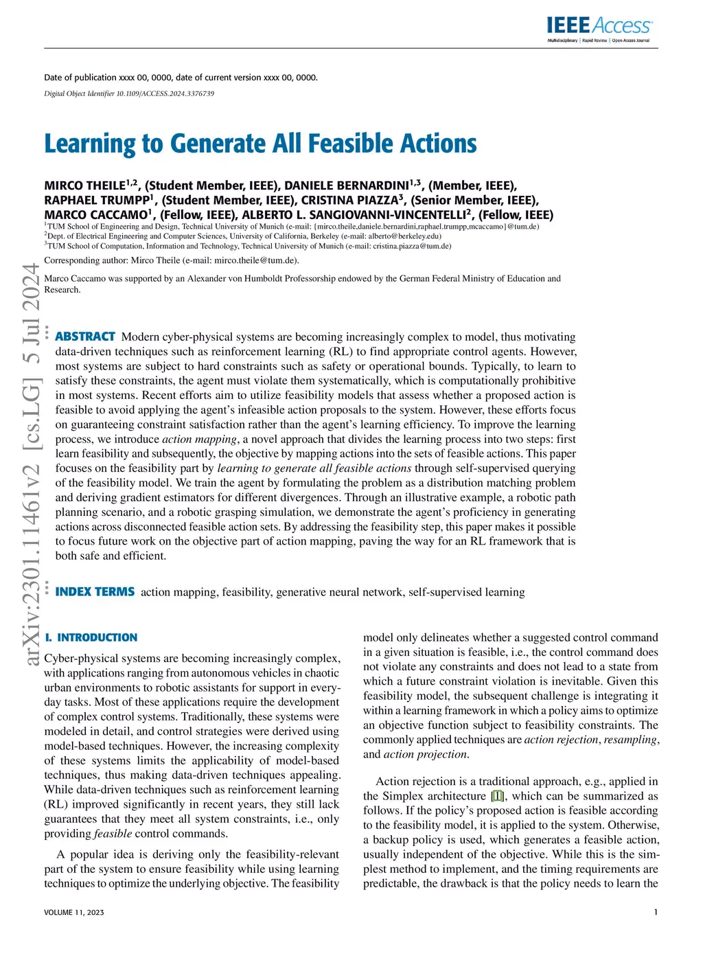 Modern cyber-physical systems are becoming increasingly complex to model, thus motivating data-driven techniques such as reinforcement learning (RL) to find appropriate control agents. However, most systems are subject to hard constraints such as safety or operational bounds. Typically, to learn to satisfy these constraints, the agent must violate them systematically, which is computationally prohibitive in most systems. Recent efforts aim to utilize feasibility models that assess whether a proposed action is feasible to avoid applying the agent's infeasible action proposals to the system. However, these efforts focus on guaranteeing constraint satisfaction rather than the agent's learning efficiency. To improve the learning process, we introduce action mapping, a novel approach that divides the learning process into two steps: first learn feasibility and subsequently, the objective by mapping actions into the sets of feasible actions. This paper focuses on the feasibility part by learning to generate all feasible actions through self-supervised querying of the feasibility model. We train the agent by formulating the problem as a distribution matching problem and deriving gradient estimators for different divergences. Through an illustrative example, a robotic path planning scenario, and a robotic grasping simulation, we demonstrate the agent's proficiency in generating actions across disconnected feasible action sets. By addressing the feasibility step, this paper makes it possible to focus future work on the objective part of action mapping, paving the way for an RL framework that is both safe and efficient.