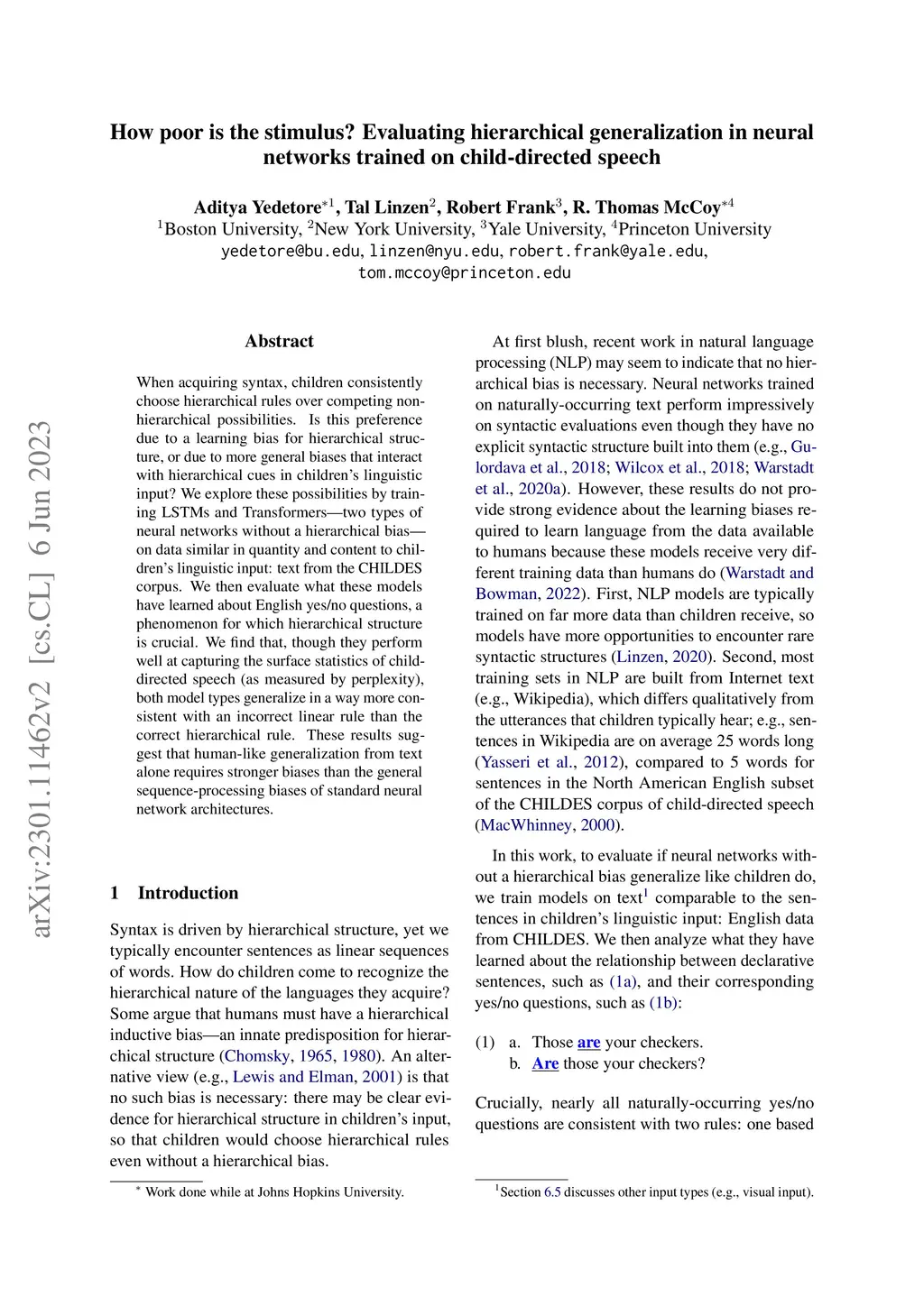 When acquiring syntax, children consistently choose hierarchical rules over competing non-hierarchical possibilities. Is this preference due to a learning bias for hierarchical structure, or due to more general biases that interact with hierarchical cues in children's linguistic input? We explore these possibilities by training LSTMs and Transformers - two types of neural networks without a hierarchical bias - on data similar in quantity and content to children's linguistic input: text from the CHILDES corpus. We then evaluate what these models have learned about English yes/no questions, a phenomenon for which hierarchical structure is crucial. We find that, though they perform well at capturing the surface statistics of child-directed speech (as measured by perplexity), both model types generalize in a way more consistent with an incorrect linear rule than the correct hierarchical rule. These results suggest that human-like generalization from text alone requires stronger biases than the general sequence-processing biases of standard neural network architectures.