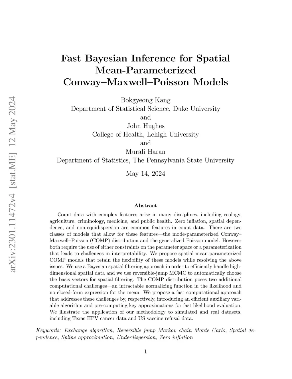 Vaccination is widely acknowledged as one of the most effective tools for preventing disease. However, there has been a rise in parental refusal and delay of childhood vaccination in recent years in the United States. This trend undermines the maintenance of herd immunity and elevates the likelihood of outbreaks of vaccine-preventable diseases. Our aim is to identify demographic or socioeconomic characteristics associated with vaccine refusal, which could help public health professionals and medical providers develop interventions targeted to concerned parents. We examine US county-level vaccine refusal data for patients under five years of age collected on a monthly basis during the period 2012--2015. These data exhibit challenging features: zero inflation, spatial dependence, seasonal variation, and spatially-varying dispersion, for data observed on approximately 3,000 counties per month. We propose a flexible zero-inflated Conway--Maxwell--Poisson (ZICOMP) regression model that addresses these challenges. Because the ZICOMP model has an intractable normalizing function, Bayesian inference can be difficult. We propose a new hybrid Monte Carlo algorithm that permits efficient sampling, automatically selects a basis representation for the spatial process via reversible jump MCMC, and provides asymptotically exact approximations of the posterior distribution of the model parameters. We use our approach to learn about characteristics impacting vaccine refusal in the US.