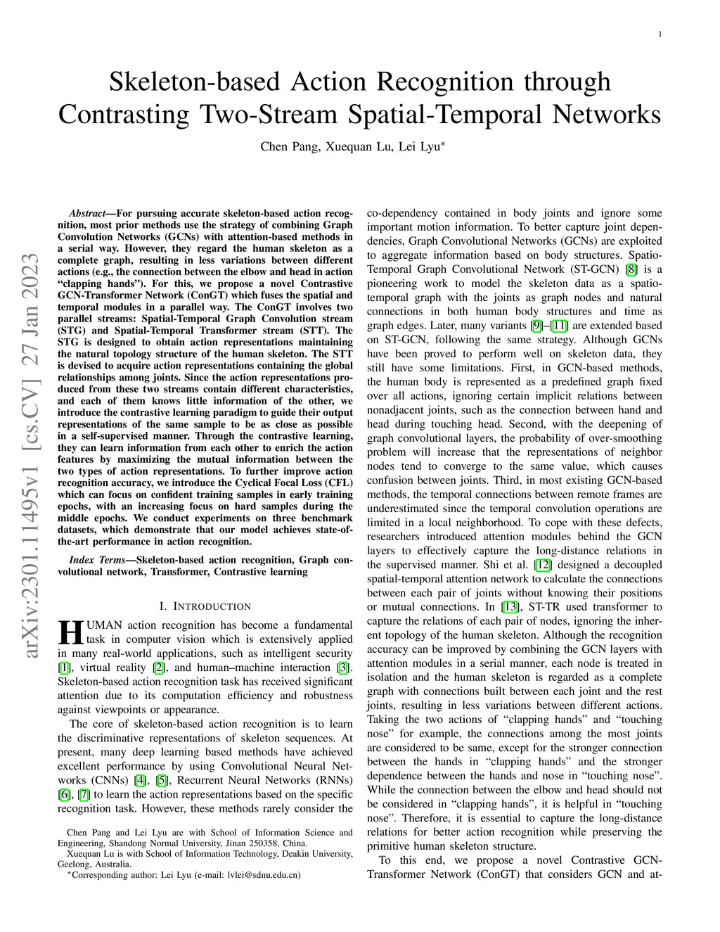 For pursuing accurate skeleton-based action recognition, most prior methods use the strategy of combining Graph Convolution Networks (GCNs) with attention-based methods in a serial way. However, they regard the human skeleton as a complete graph, resulting in less variations between different actions (e.g., the connection between the elbow and head in action ``clapping hands''). For this, we propose a novel Contrastive GCN-Transformer Network (ConGT) which fuses the spatial and temporal modules in a parallel way. The ConGT involves two parallel streams: Spatial-Temporal Graph Convolution stream (STG) and Spatial-Temporal Transformer stream (STT). The STG is designed to obtain action representations maintaining the natural topology structure of the human skeleton. The STT is devised to acquire action representations containing the global relationships among joints. Since the action representations produced from these two streams contain different characteristics, and each of them knows little information of the other, we introduce the contrastive learning paradigm to guide their output representations of the same sample to be as close as possible in a self-supervised manner. Through the contrastive learning, they can learn information from each other to enrich the action features by maximizing the mutual information between the two types of action representations. To further improve action recognition accuracy, we introduce the Cyclical Focal Loss (CFL) which can focus on confident training samples in early training epochs, with an increasing focus on hard samples during the middle epochs. We conduct experiments on three benchmark datasets, which demonstrate that our model achieves state-of-the-art performance in action recognition.